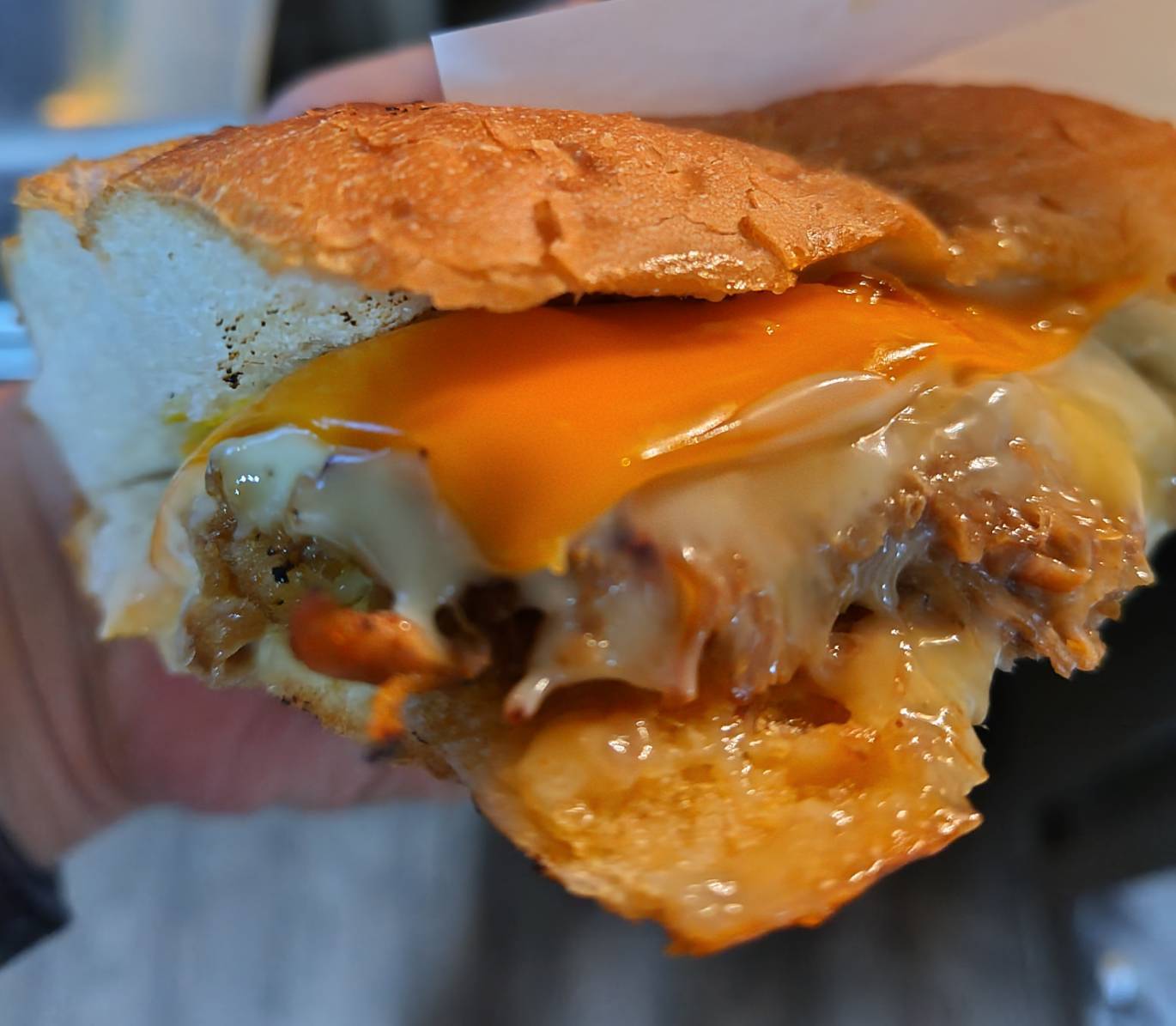 こんがりと焼き上げられたキューバンブレッドに、BBQ味のお肉、チーズ、ピクルスが挟んであり、ボリューム満点です。パンの隙間からしたたりおちる白いソースの味がやみつきになります。