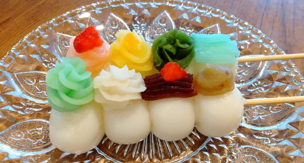 看板商品の『恋団子』は、もっちりとした白団子にカラフルなあんこがトッピングされた、とても華やかで可愛らしいお団子です。