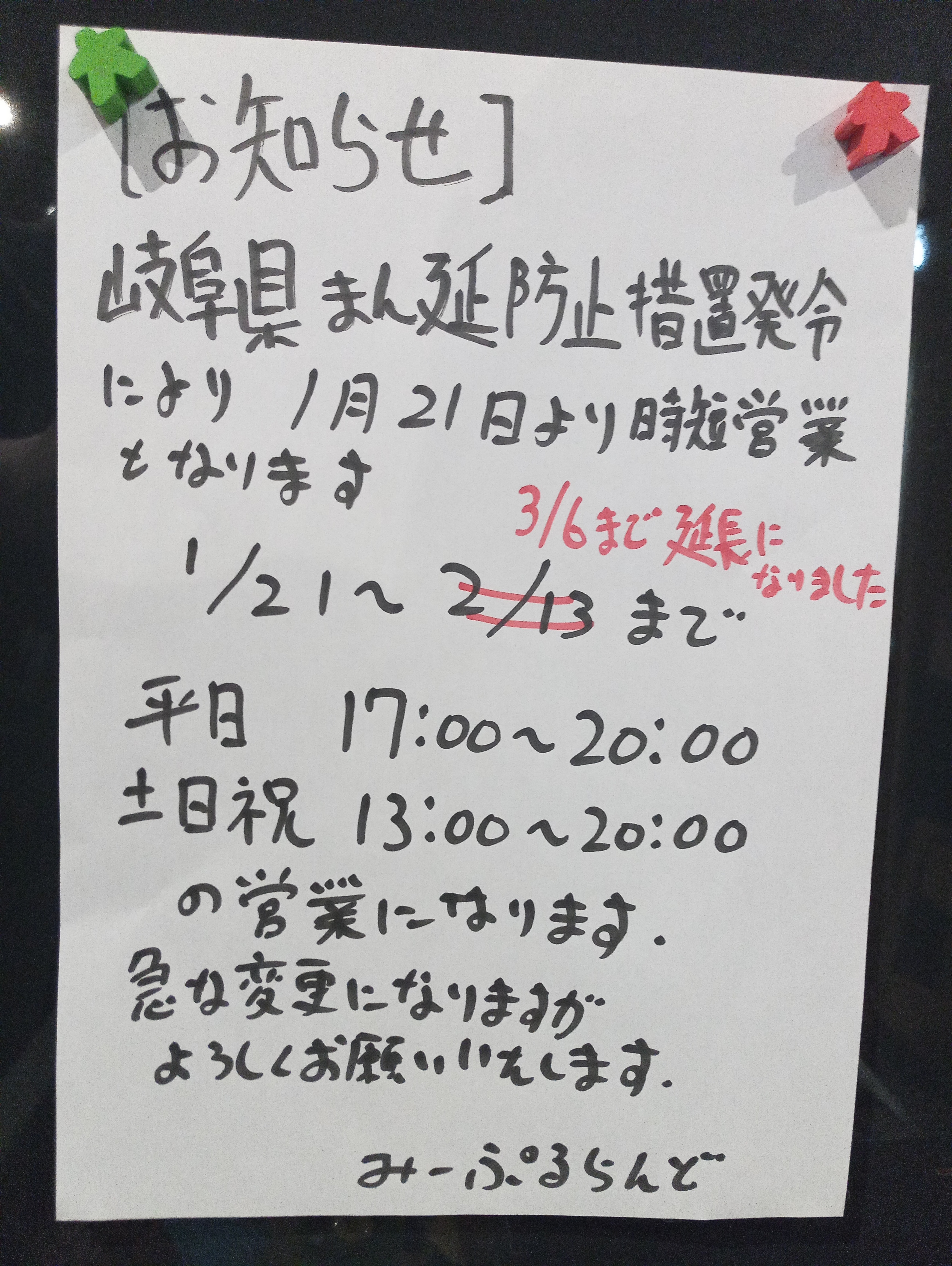 時短営業延長要請により3月6日まで20:00までの営業になります。