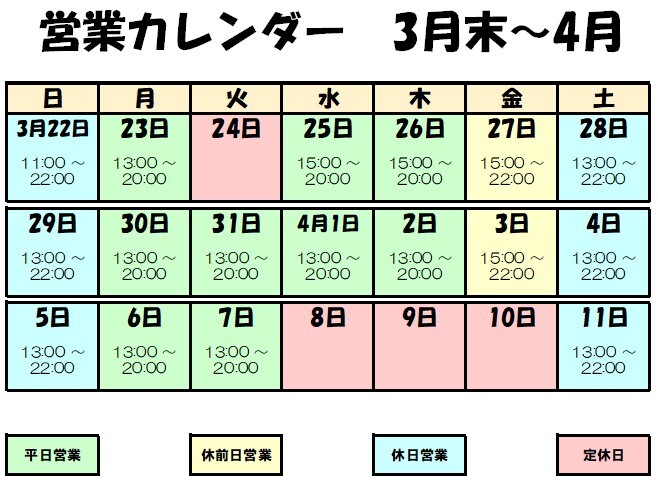・2026年3月末~4月初旬の『営業カレンダー』を更新しました。