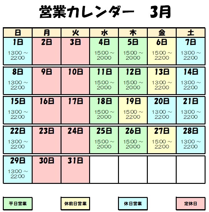 ・2026年3月の『営業カレンダー』を更新しました。