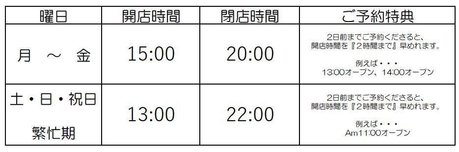 ・2日前までのご予約により、開店時間を「2時間まで」延長できます。