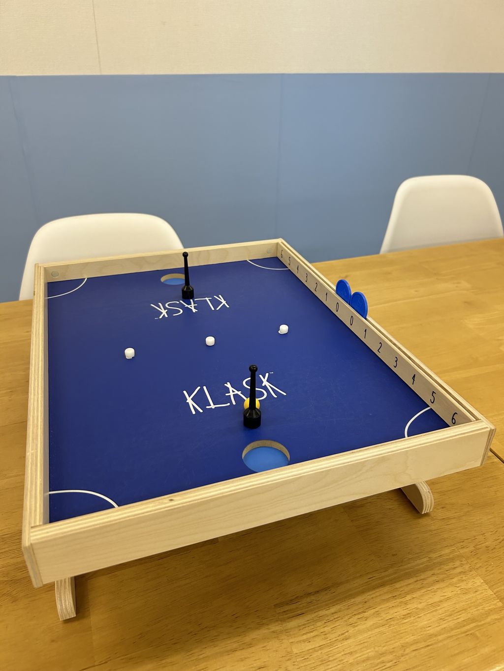 ◎ゲーム概要:デンマーク発祥のエアホッケー風ボードゲーム。台の下から磁力で動くコマを動かして、ボールを相手のゴールに入れることを目指します。 ボード上には磁石でできた障害物が3つあり、これが自分の操るコマに2つくっつくと失点となってしまうので注意しなければなりません。
