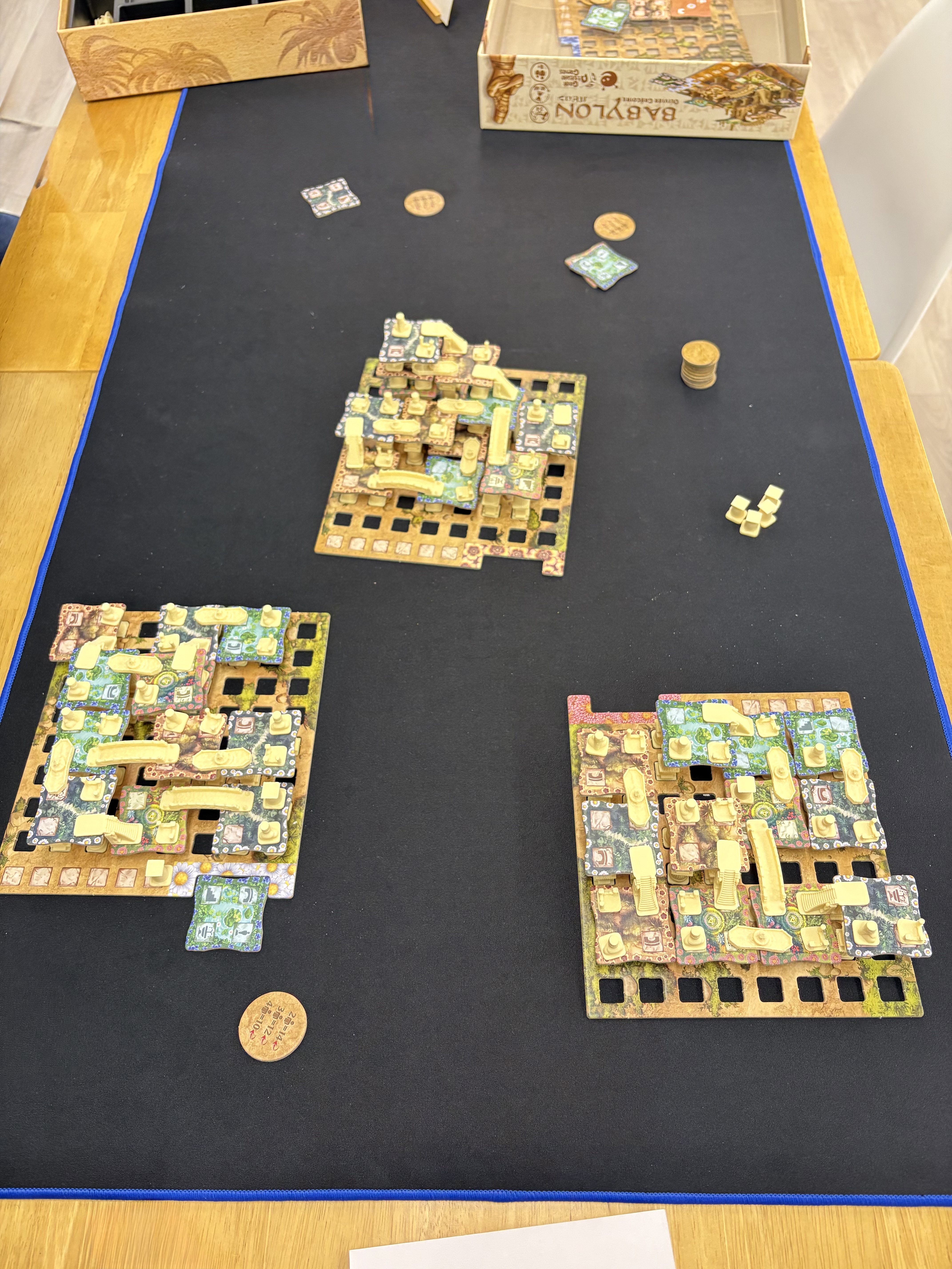 ・ゲーム詳細:古代バビロニアの建築家となり、柱とタイルを使って個人ボード上に立体的な空中庭園を築くタイル配置&立体パズルゲーム。
