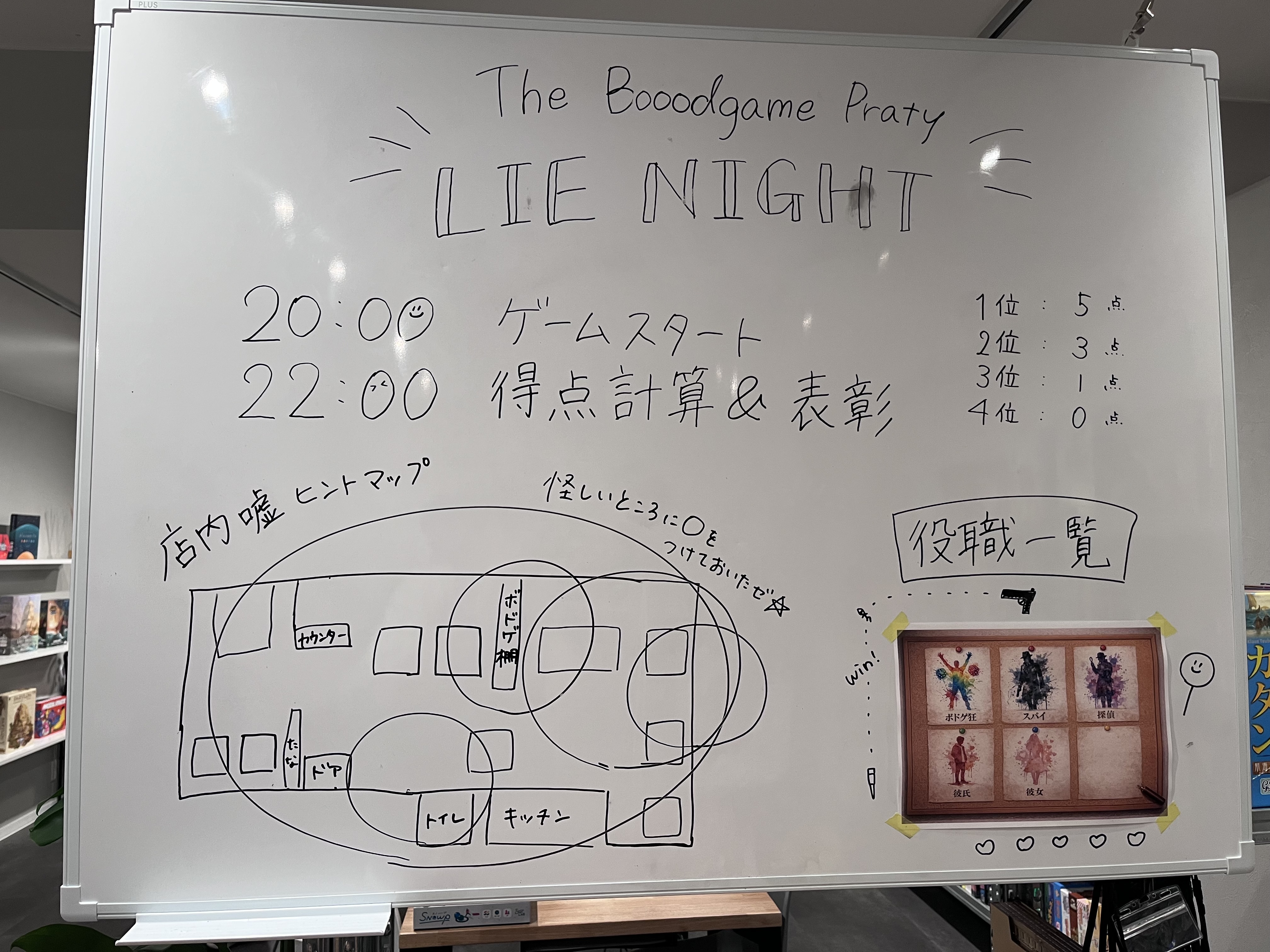 プレイの合間に店内をよく観察しながら、「あれ、これ何かおかしくない?」と嘘を探す時間もあり、ゲーム卓の外でも会話が生まれていました。