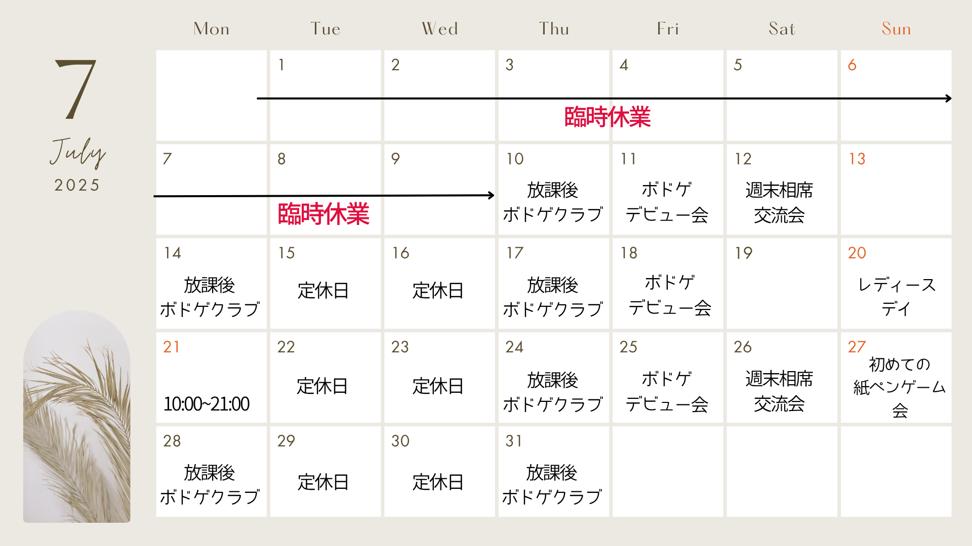 - 5ヶ月前2025年07月10日 16時17分頃営業を再開いたしました。長らくお休みを頂いており、お客様にはご迷惑おかけしました。本日より営業を再開させていただきます🙇♀️ 改めて今月のイベント予定です!毎週月曜、木曜日は放課後ボドゲクラブがあります🎲来月からは内容をブラッシュアップしたいと考えています!乞うご期待😘20日(日)は、ちょこちょこ情報を出していまし...26ページビュー