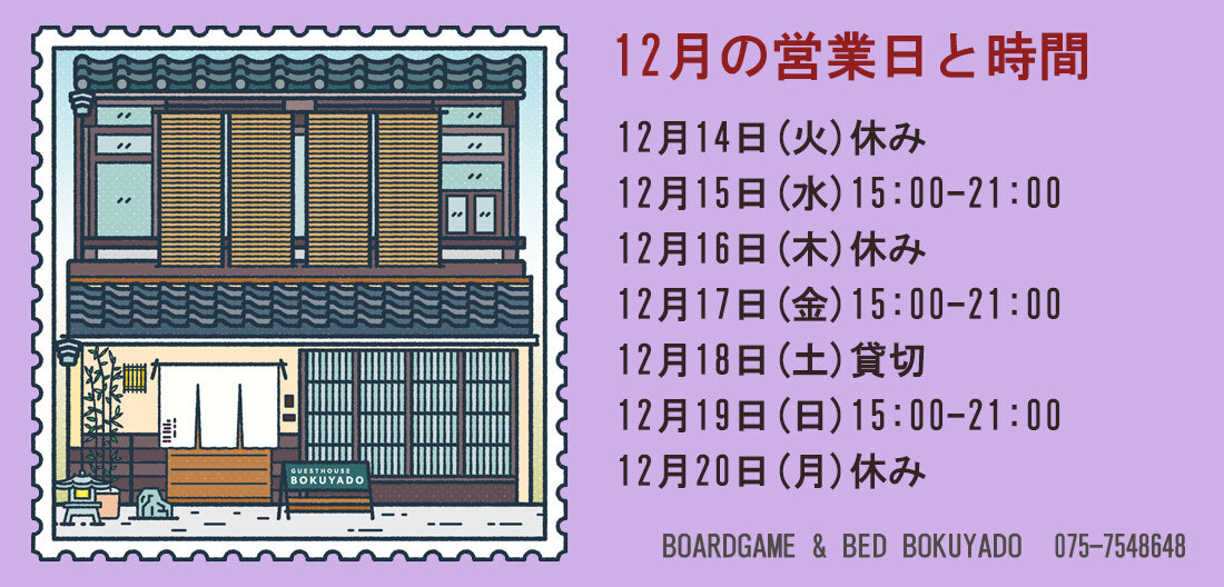 - 4年弱前2021年12月21日 13時31分頃今週の営業日について(12月)ボードゲームプレイスペース「Boardgame&Bed樸宿」今年最後の一般営業日は12月22と23日です。年末に宿のほうが忙しくなってありがたいです。残りわずかの営業日に是非遊びに来てくださいね。一年間ありがとうございました。407ページビュー