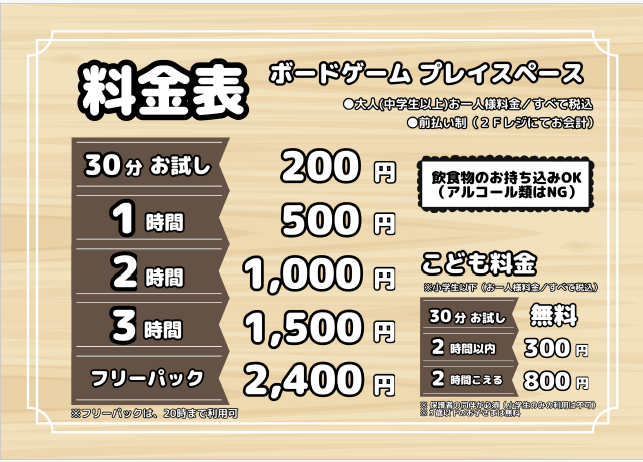 | 料金レンジ | 1時間 500円~フリーパック 2,400円(20時まで利用可) |