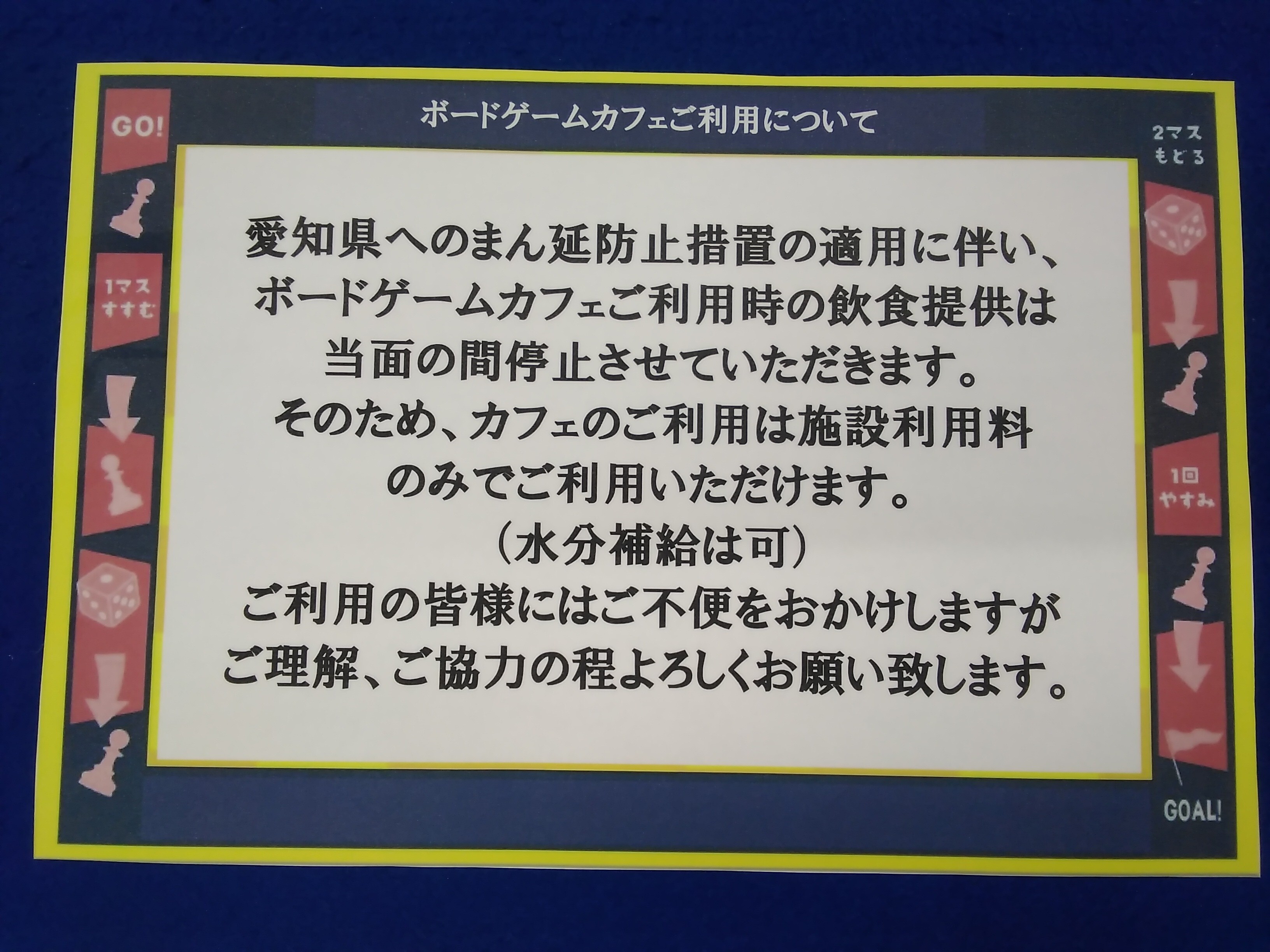 愛知県内で発令中のまん延防止措置の状況をふまえ、当面の間、当店カフェでの飲食提供を停止させていただきます。そのため、カフェは施設利用料のみでご利用いただけます。