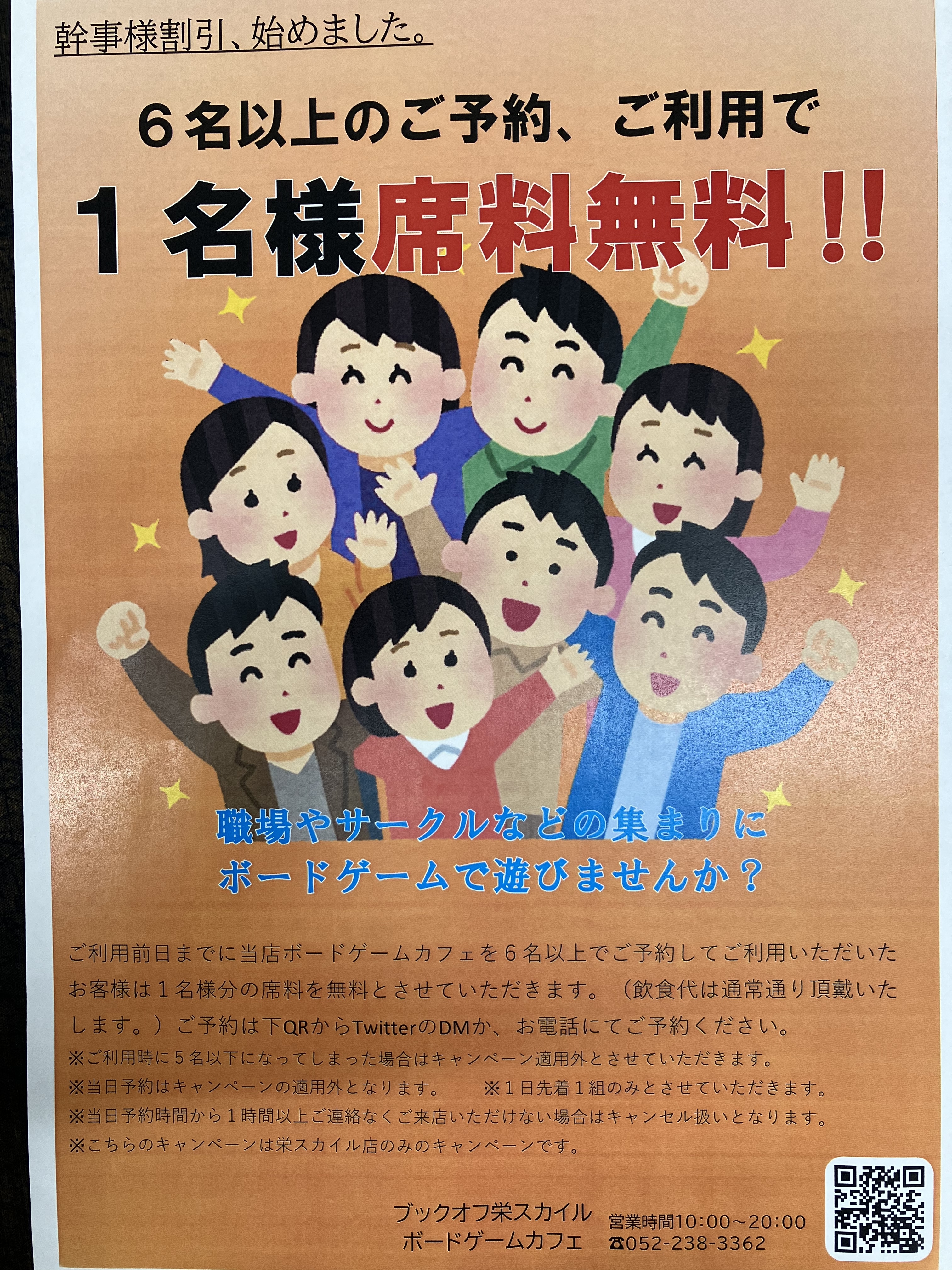 6名以上で当店ボードゲームカフェをご予約、ご利用いただいたお客様は1名様分の席料が無料になるキャンペーンを開始しました。