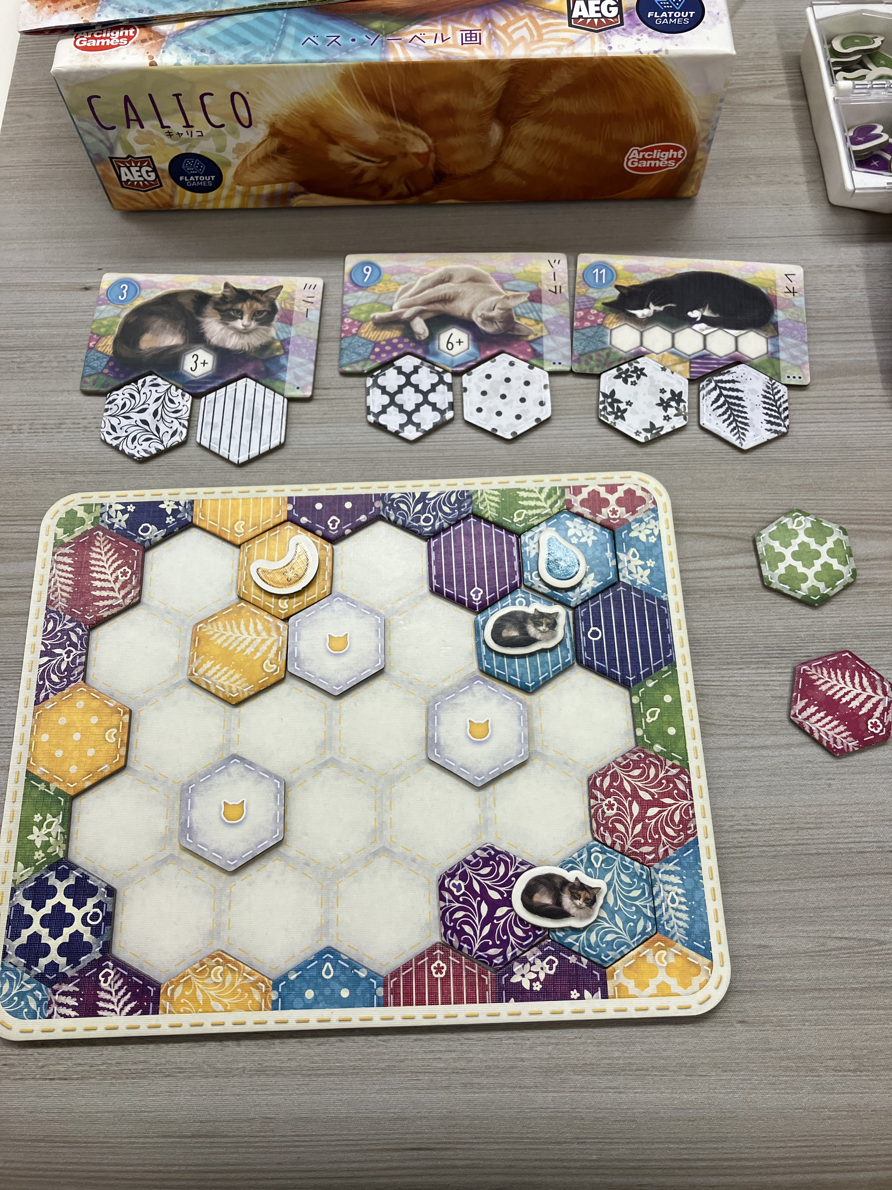 カラフルな模様タイルとネコが可愛い『キャリコ』。2枚持っているタイルのうち1枚をボードに配置して、場にある3枚から1枚引く。遊び方がシンプルなゲームです。今回はビギナー向けに更にシンプルなファミリールールを採用しました。タイルの模様でネコを、タイルの色でボタンをひたすら集めるだけのルールになっています。