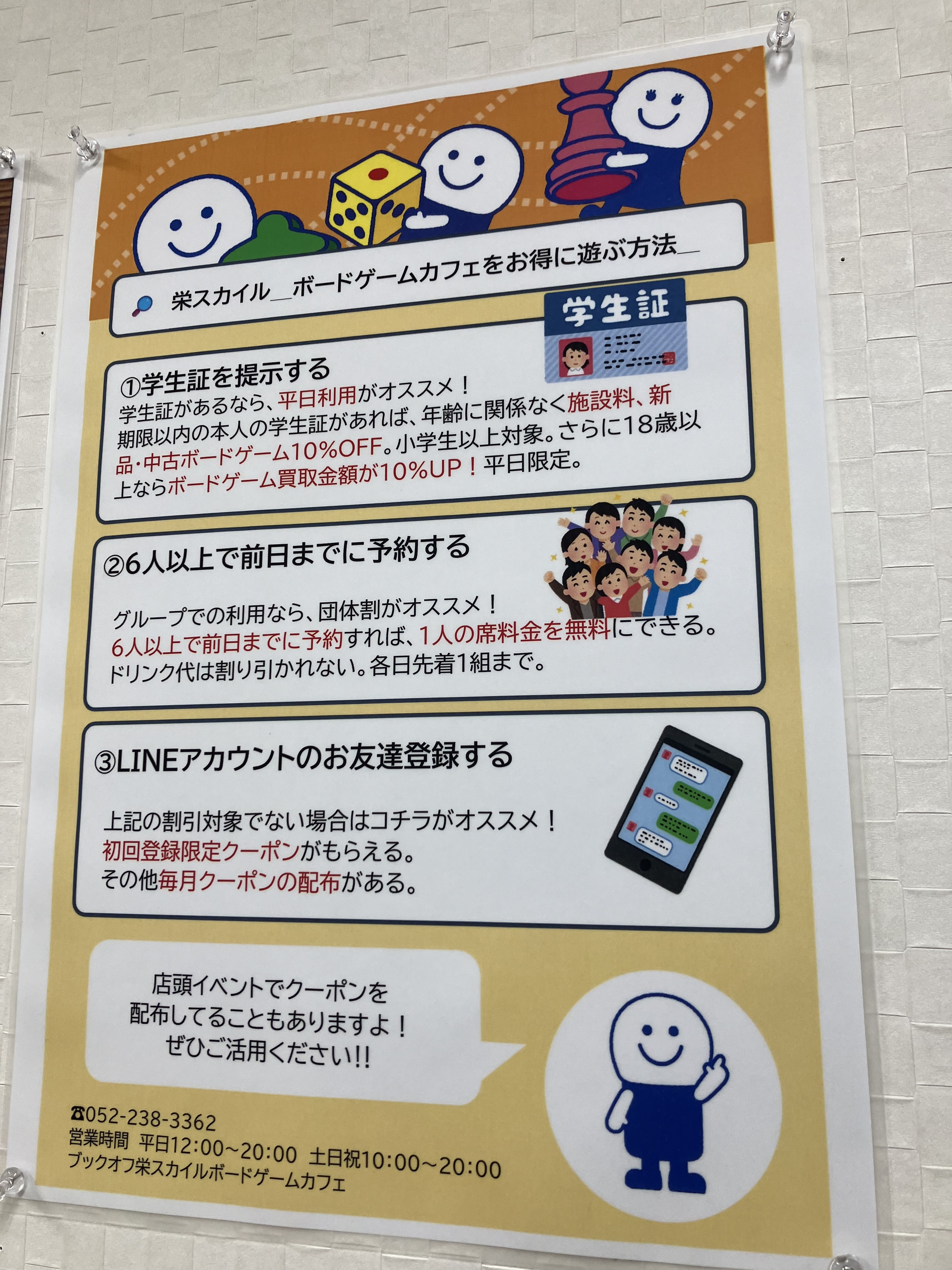 - 6ヶ月前2025年06月01日 14時14分頃6月7月平日限定料金キャンペーン開催中❗️6/2〜7/31の平日にブックオフ栄スカイル店ボードゲームカフェのご利用がお安くなります❗️1時間ドリンク無し500円フリータイムワンドリンク1000円フリータイムフリードリンク1500円でカフェをご利用することができます‼️学生さんはさらにお得!キャンペーン期間中、学生証をご提示いただいた場...92ページビュー