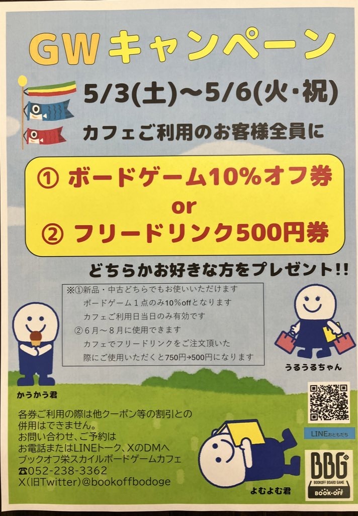 - 8ヶ月前2025年04月04日 16時12分頃GWカフェキャンペーンを開催します❗️GW期間中(5/2〜5/6)カフェを利用した全員に・当日使えるボドゲ10%off券(新品・中古)・6〜8月で使えるフリードリンク500円券のどちらかをプレゼントします❗️各券ご利用の際は他クーポン等の割引とは併用できません。ご了承くださいませご予約はお電話か当店XへのDM、LINEでも受付して...79ページビュー