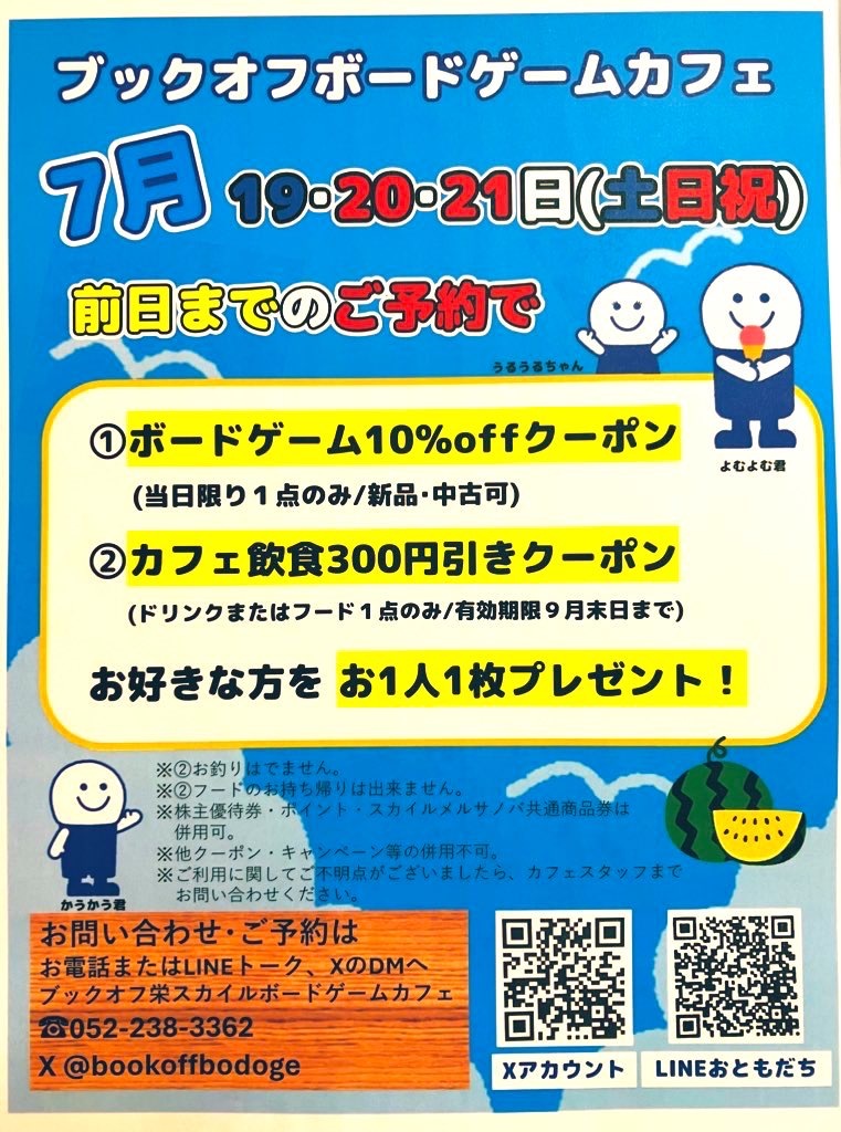 - 5ヶ月前2025年07月15日 11時15分頃7月三連休ご予約キャンペーンを開催します❗️前日までにご予約していただた7月19,20,21日にカフェを利用した全員に・当日使えるボドゲ10%off券(新品・中古)・9月末で使えるカフェ飲食300円引券のどちらかをプレゼントします❗️各券ご利用の際は他クーポン等の割引とは併用できません。ご了承くださいませご予約はお電話か当店XへのDM、...27ページビュー