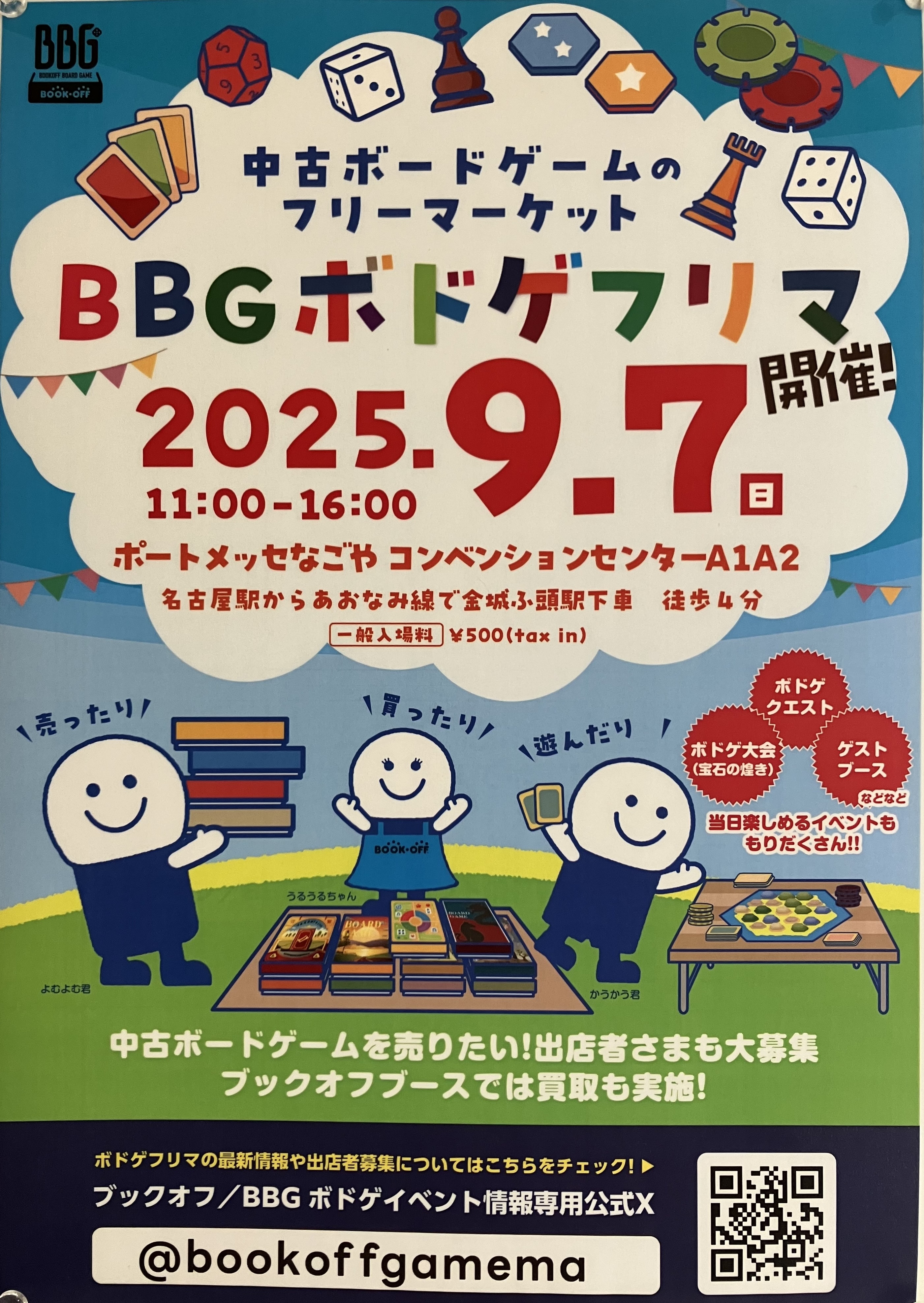 - 4ヶ月前2025年07月30日 18時01分頃ブックオフ主催のボードゲームフリーマーケット再び開催!ブックオフ主催の中古ボードゲームフリーマーケット『BBGボドゲフリマ』が再び開催されます!今年2月、名古屋駅近くの会場で開催されたブックオフ主催のボードゲームだけのフリーマーケット『BBGボドゲフリマ』。今回は会場を『ポートメッセ名古屋』に移して再び開催することになりました!今回も中古ボードゲ...361ページビュー