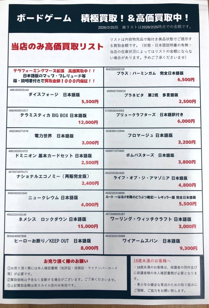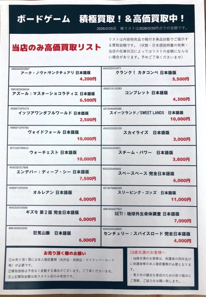 - 約3時間前2026年02月26日 12時45分頃買取チラシ更新しました!買取金額UPキャンペーンも実施中です!2〜3月版の買取チラシ更新しましたここに記載されてないボードゲームも買取しています!ゲームマーケットなどのイベントで販売されたボードゲームもお売りいただけますので是非お持ちください買取金額UPキャンペーン実施中買取金額UPキャンペーンは3/14まで開催中です査定金額が300円以上になったボード...5ページビュー