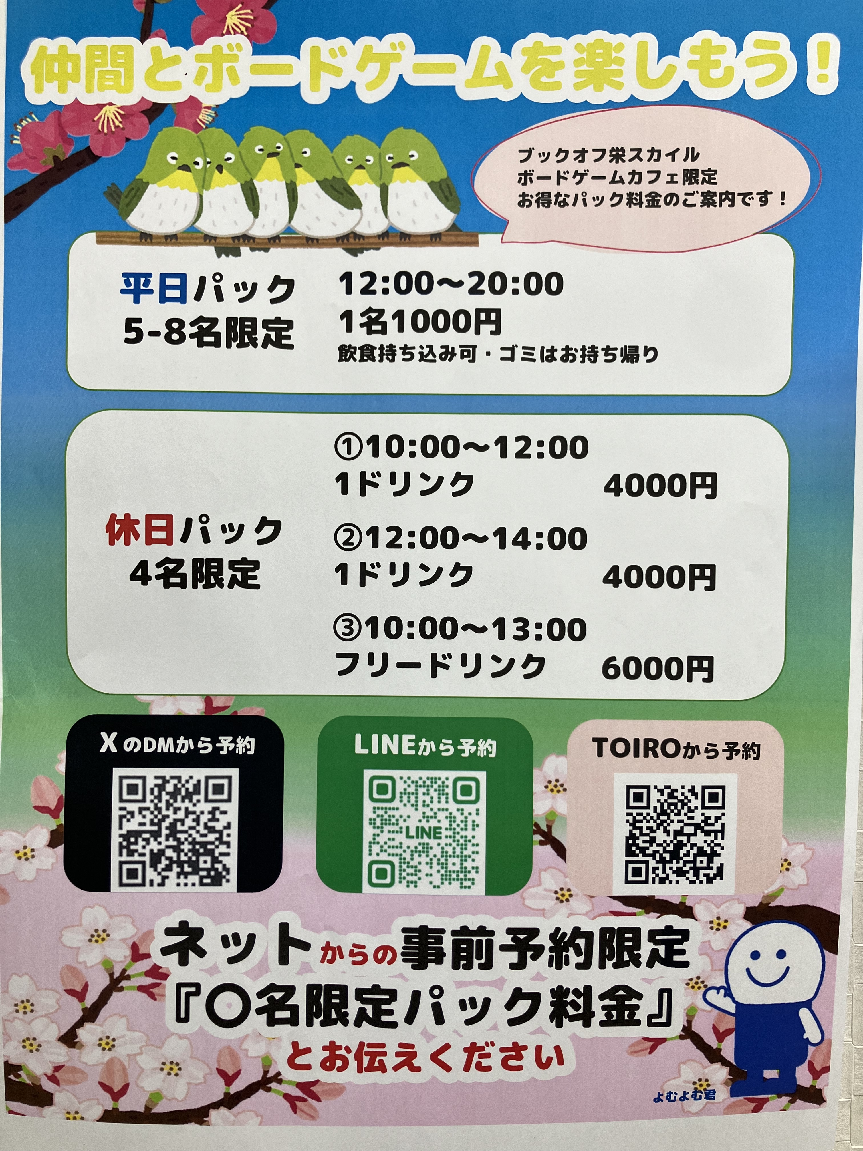 - 約9時間前2026年03月11日 13時39分頃【お知らせ】新パック料金を実装いたします٩( 'ω' )و【人数時間指定】この度、カフェにて新しくネット予約限定プランを実装いたしました!人数、時間指定をさせていただきますが、その分お得にカフェをご利用いただけます❗️土日➡️2〜3時間、4人専用プラン平日➡️最大8時間、5〜8人専用プラン※来店当日、お電話では受付しておりません※ブックオフ栄スカイル店限定です予約は...3ページビュー