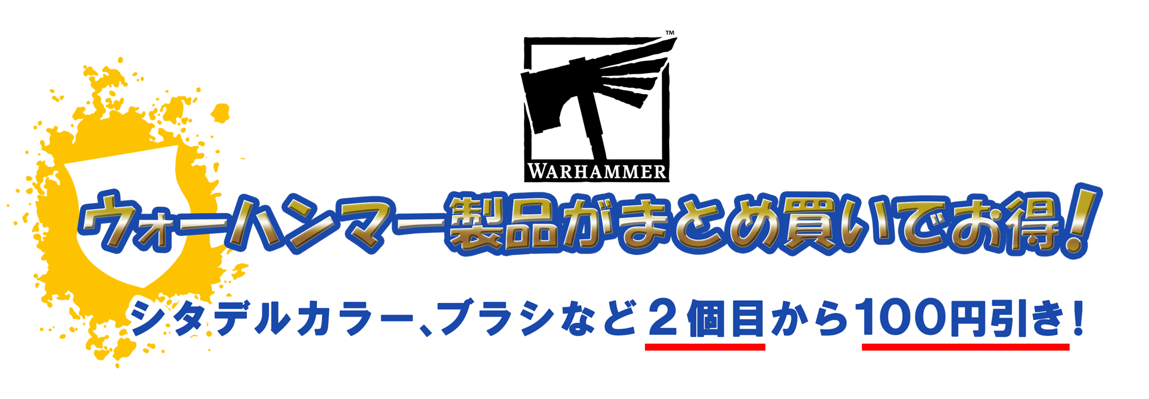 店内にて販売中のウォーハンマー製品、シタデルカラー、ブラシなど2点以上まとめ買いして頂くと、2点目からの商品を100円引きにてご購入頂けます!