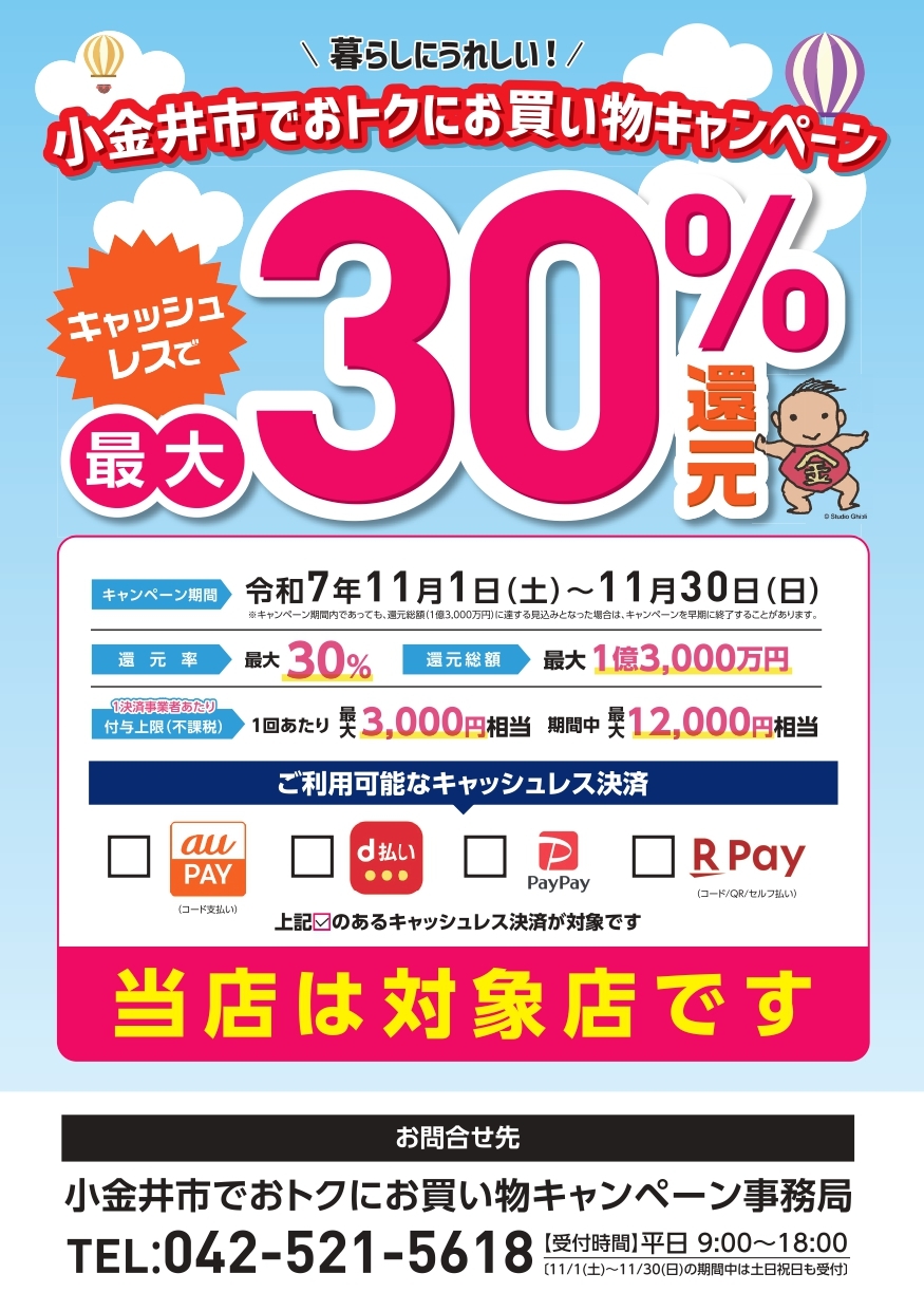 - 約1ヶ月前2025年11月02日 14時06分頃30%還元!小金井市でおトクにキャンペーン!小金井市限定!キャッシュレス決済でおトクにお買い物キャンペーン開催です!当店の場合ですと「auPAY(コード支払い)」「d払い」「PayPay」でQRコード決済にてお支払い頂くと最大30%還元されます!キャンペーン期間は11月1日(土曜)~11月30日(日曜)まで!ドリンク、店内利用料金、ボー...34ページビュー