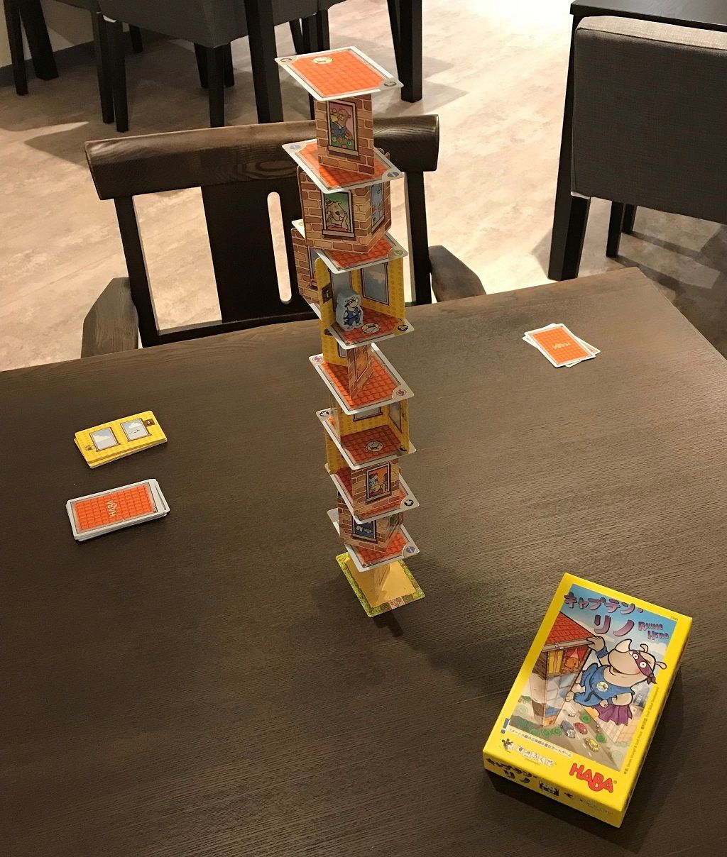 カードを建ててマンション建設。リノはどこまで登れるのか!