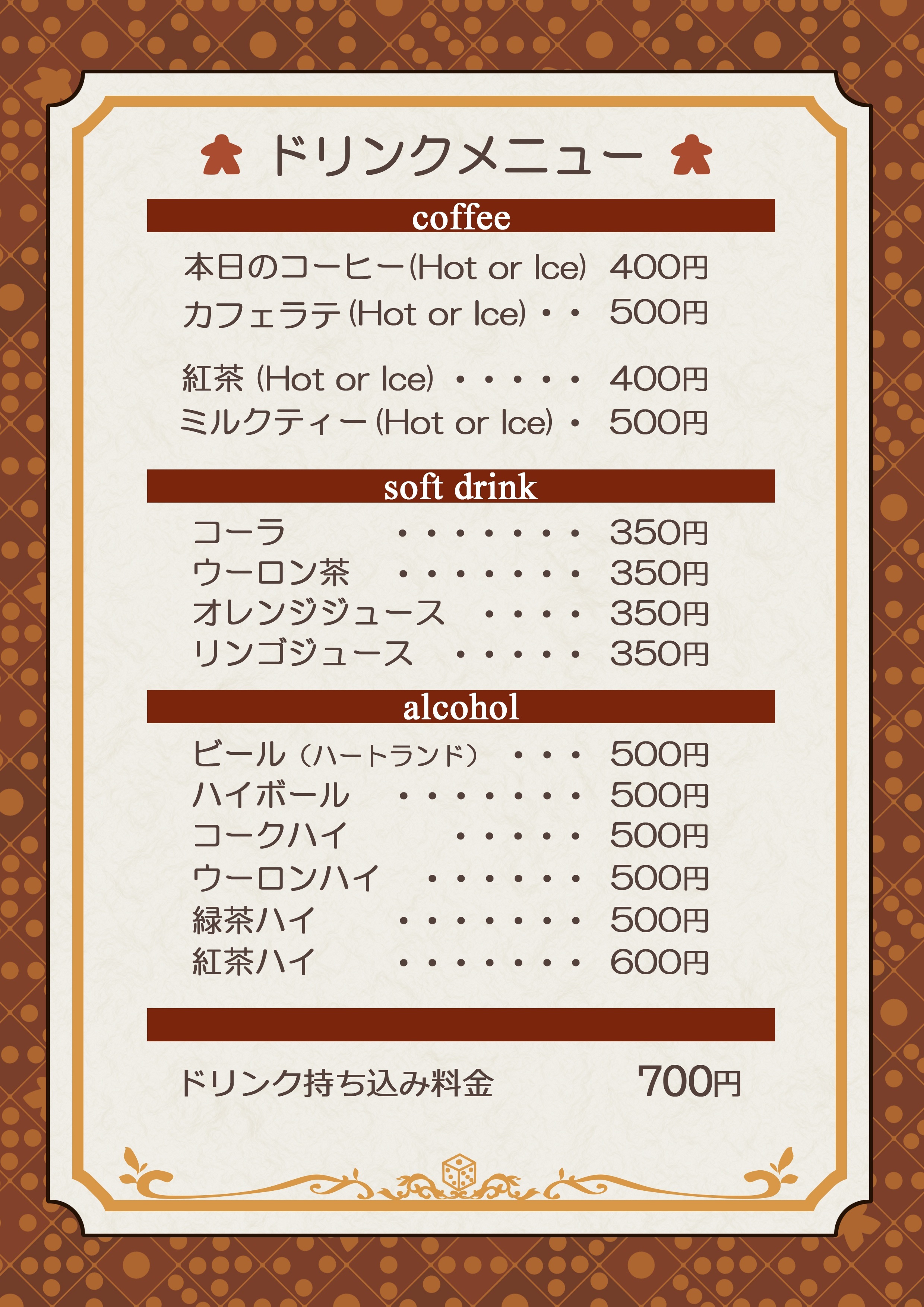 | 備考 | ・お持ち込みのドリンクを飲まれる場合はドリンク持ち込み料金として