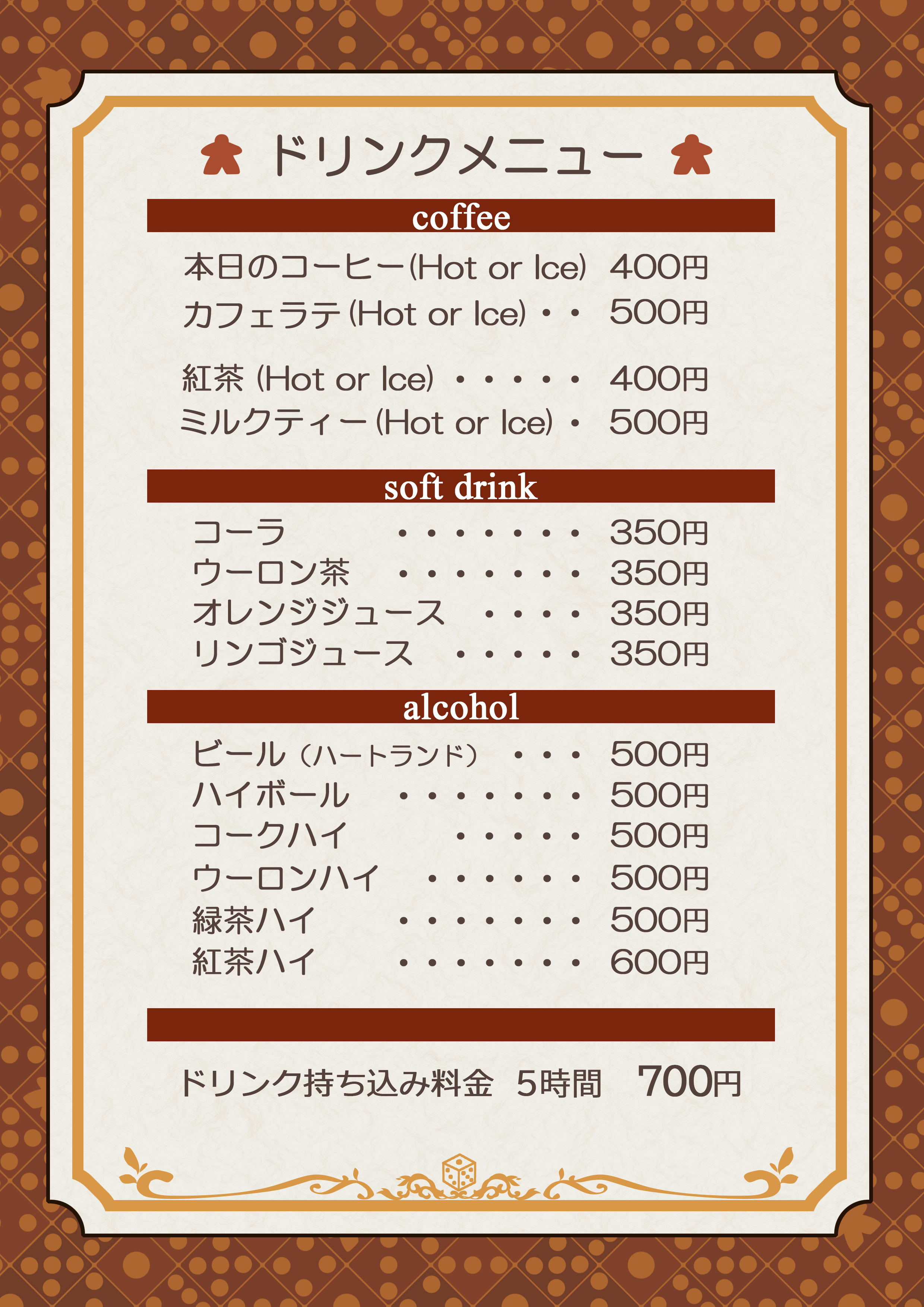 ドリンク持ち込みにて利用時間が5時間を超えていた場合は700円が追加料金となります。
