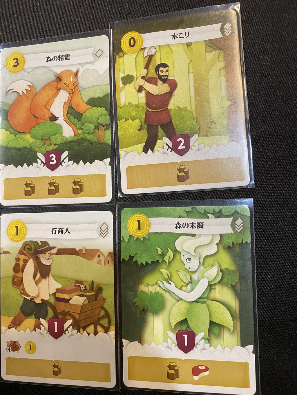 森の精霊、木こり、行商人、森の末裔などが資源を生産します。