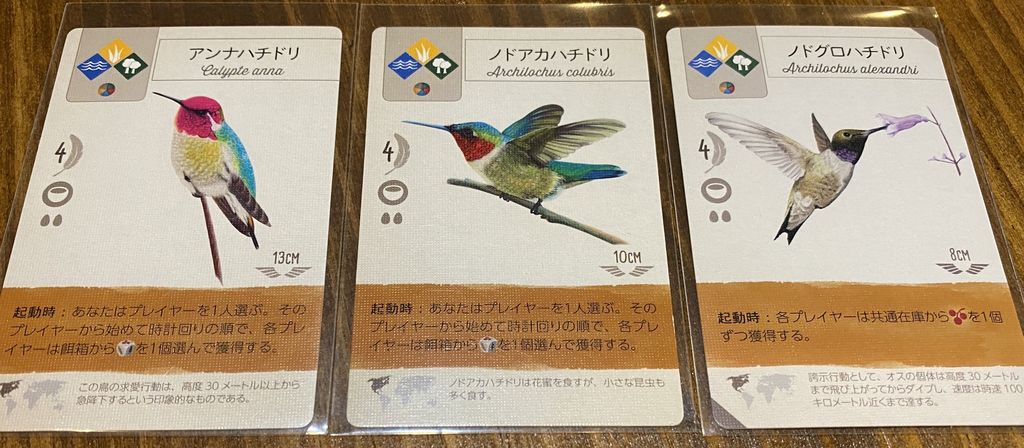 ハチドリは出すだけで場がインフレします。最初の手札にあったら迷わずに鳥カード獲得の列に出してしまって良いでしょう。その時は、さらに2.3枚連続で鳥カード獲得の列にカードを出せるようにしていきたいです。
