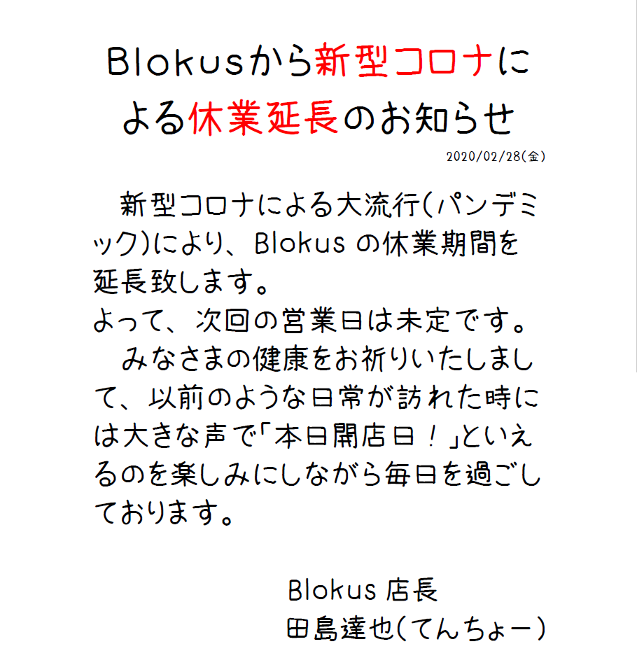 Blokusとしては緊急事態宣言が解消されない限りは開店を控える方針です。