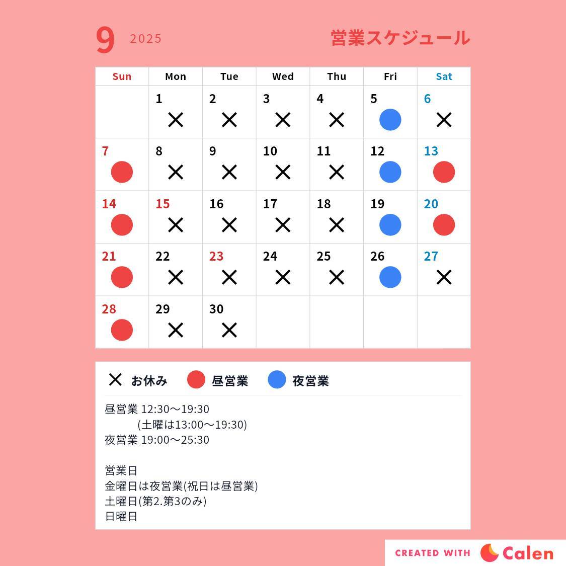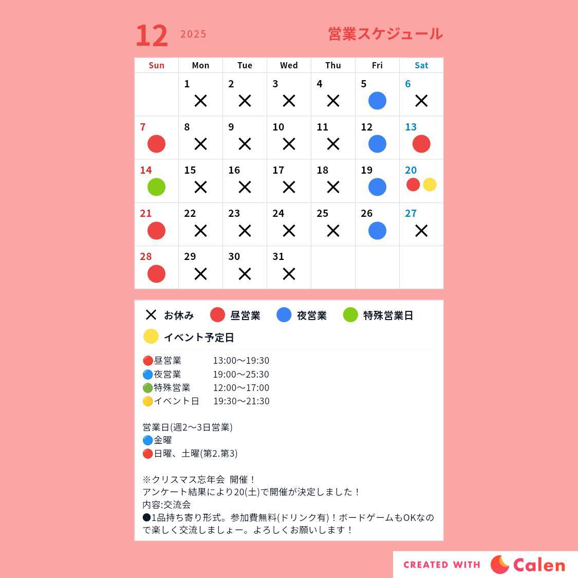 祝日は不定期営業(Xにて告知) 金曜 19:00~25:30 (金祝)は12:30~19:30で営業 土曜 13:00~19:30(第2.3のみ) 日曜 13:00~19:30