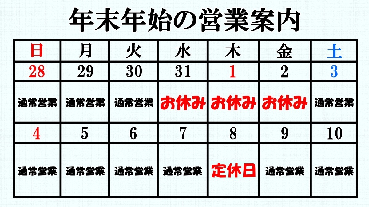 - 25日前2025年12月13日 14時18分頃年末年始の営業について年末年始の営業案内です!12/31〜1/2の期間はお休みいただきます 1/3から通常営業再開となりますので、ご了承ください 来年度もボードゲームカフェSplaをよろしくお願いいたします! ※12/26画像カレンダー一部修正73ページビュー