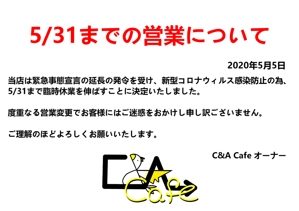 緊急事態宣言の延長の発令を受けまして、新型コロナウイルス感染予防の為、5/6までの臨時休業と予定しておりましたが、5/31まで臨時休業を延長することを決定いたしました。