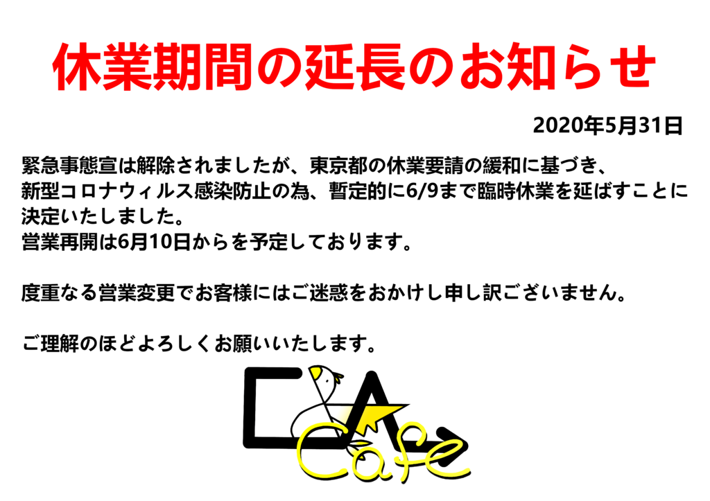 5月31日までの休業期間の予定でしたが、東京都の休業要請の緩和規定に基づき休業期間を暫定的に6月9日まで延長いたします。