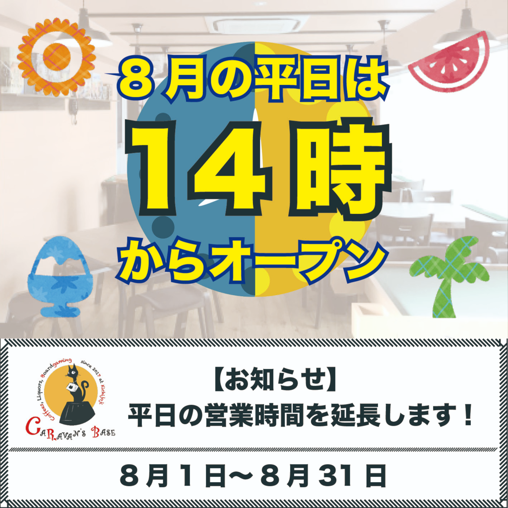 8月中の平日営業日の営業時間を、17:00~23:00 → 14:00~23:00 に変更いたします。