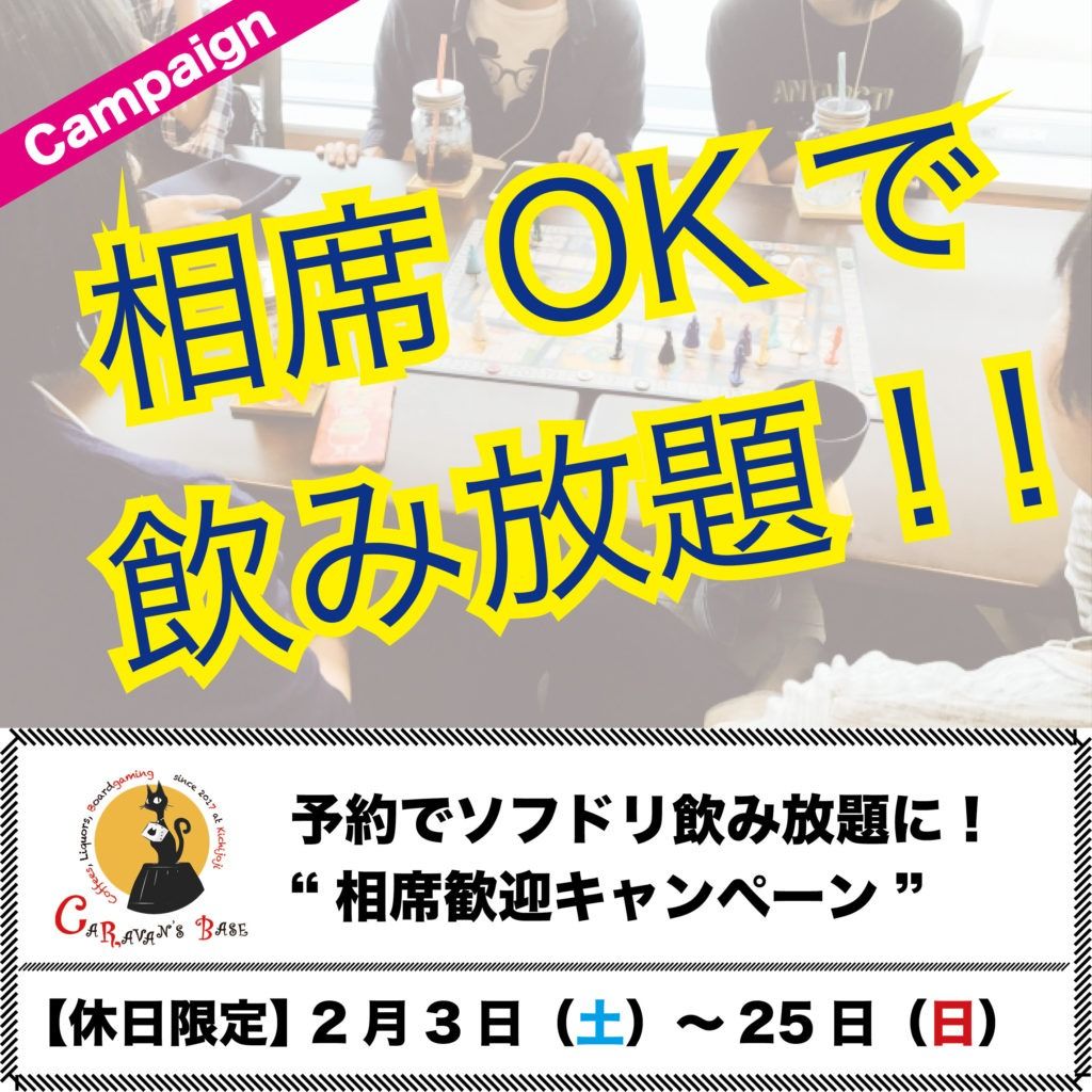 キャンペーン内容:期間中、2名以上で相席歓迎予約をされたお客様に「ソフトドリンク飲み放題」をサービスいたします!