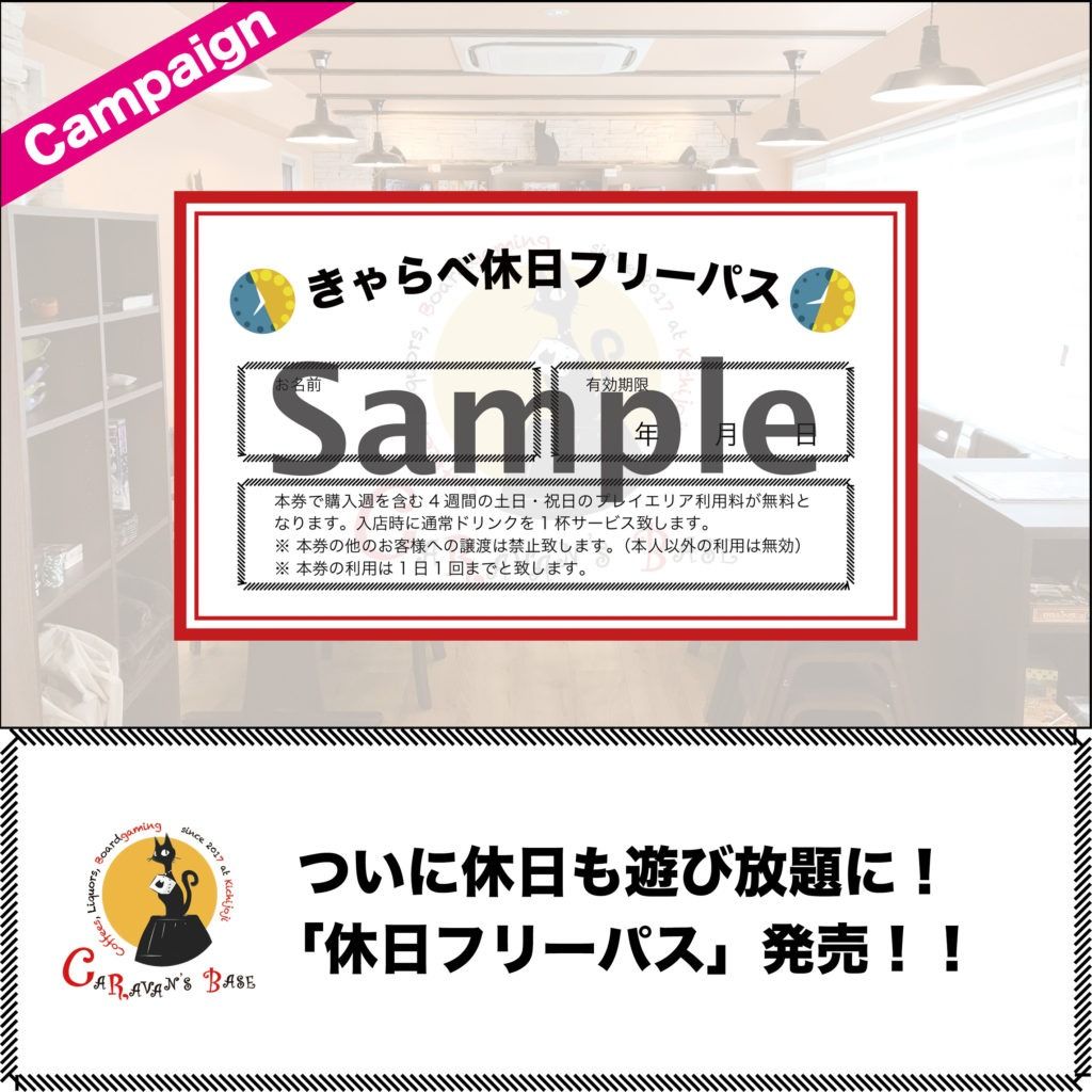 - 7年以上前2018年04月07日 16時45分頃【キャンペーン】「休日フリーパス」発売!!こんにちは!遊び人たちの秘密基地「Caravan'sBase(きゃらべ)」です。 いつも遊びに来ていただき誠にありがとうございます!土日祝日のきゃらべをより使いやすくする新サービス、「休日フリーパス」のご案内です! ご好評いただいている「平日フリーパス」の休日版!今回は試験的にキャンペーンとし...141ページビュー