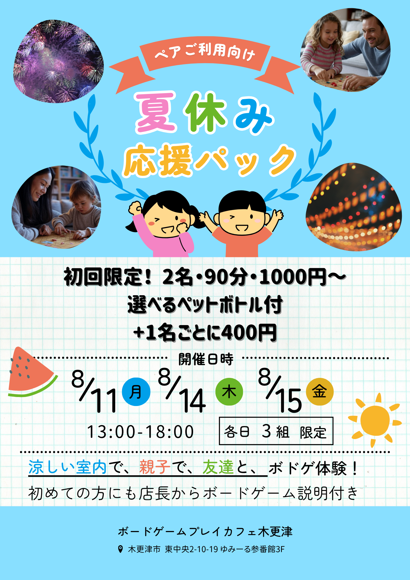 - 3ヶ月前2025年09月06日 20時10分頃応援パック 開催延長のお知らせ先月企画させていただいた夏休み応援パックですが、ご好評のため今月もプランをご用意させていただきます。1日3組限定で、90分ペアで1000円、飲み物付きのプランとなります。3人以上のご利用の場合でも、おひとり+400円で追加できます。「他のボドゲカフェは利用したことがあるけど、木更津のお店はどう...31ページビュー