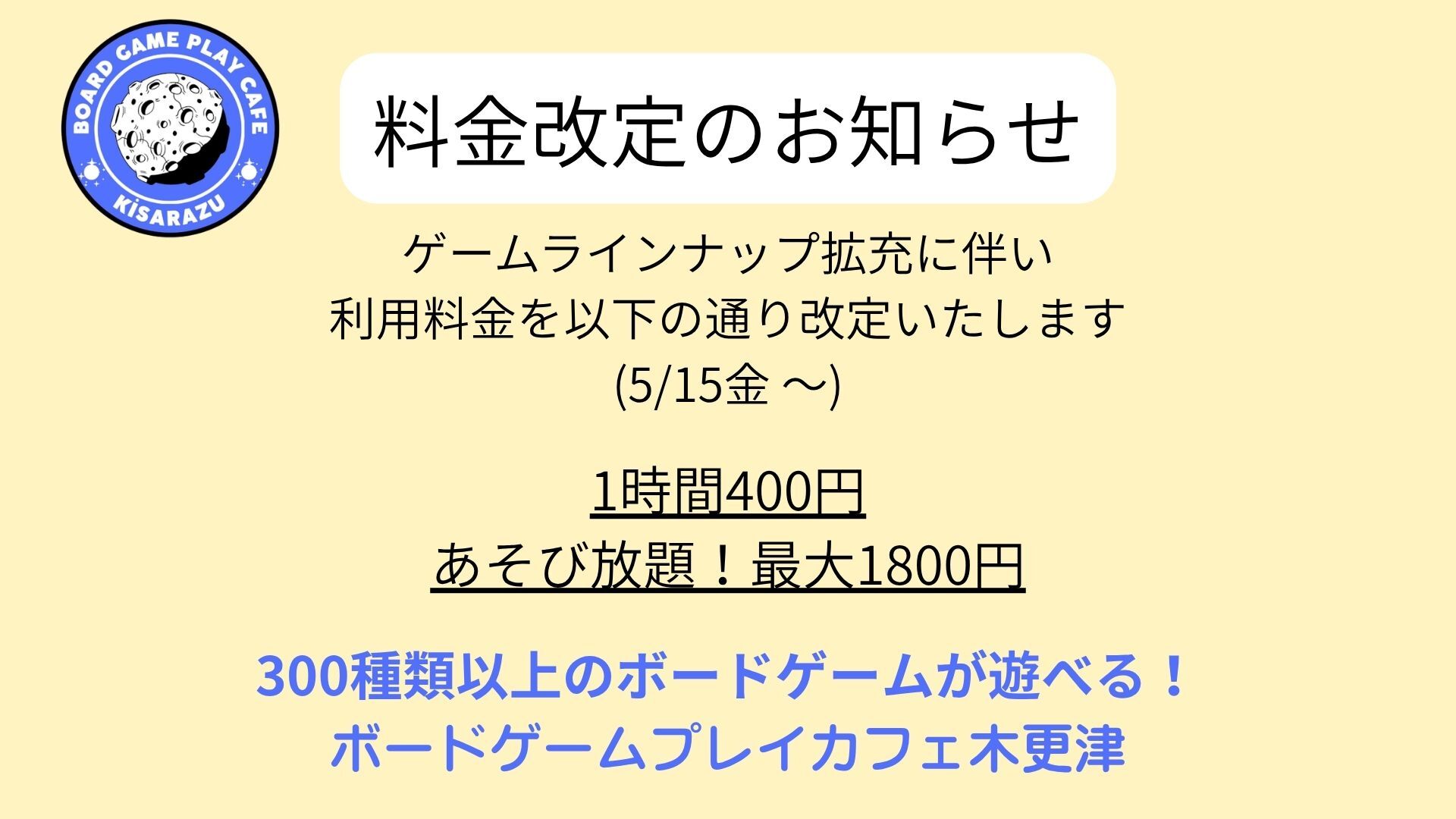- 約9時間前2026年04月13日 16時00分頃利用料金改定のお知らせ利用料金改定のお知らせです。ゲームラインナップ拡充に伴い、スペース利用料金を以下の通り改定いたします。5/15金~、1時間400円、あそび放題!最大1800円学生割引:5時間まで800円、最大1200円300種類以上のボードゲームが遊べる!ボードゲームプレイカフェ木更津を今後もご利用よろしくお...1ページビュー