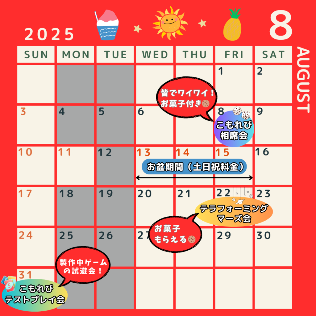 - 4ヶ月前2025年08月02日 13時24分頃【重要】8/13(水) - 15(金)は"土日祝料金 & 営業時間"でご案内致します。いつも茨木ボードゲームカフェComorebiをご利用いただきまして、誠にありがとうございます。2025/8/13(水)-15(金)までは、お盆休みの期間であり、店内混雑が予想されるため、例外として「土日祝料金」でのご案内となります。また営業時間は、11:00-21:00までとなります。(通常の...38ページビュー