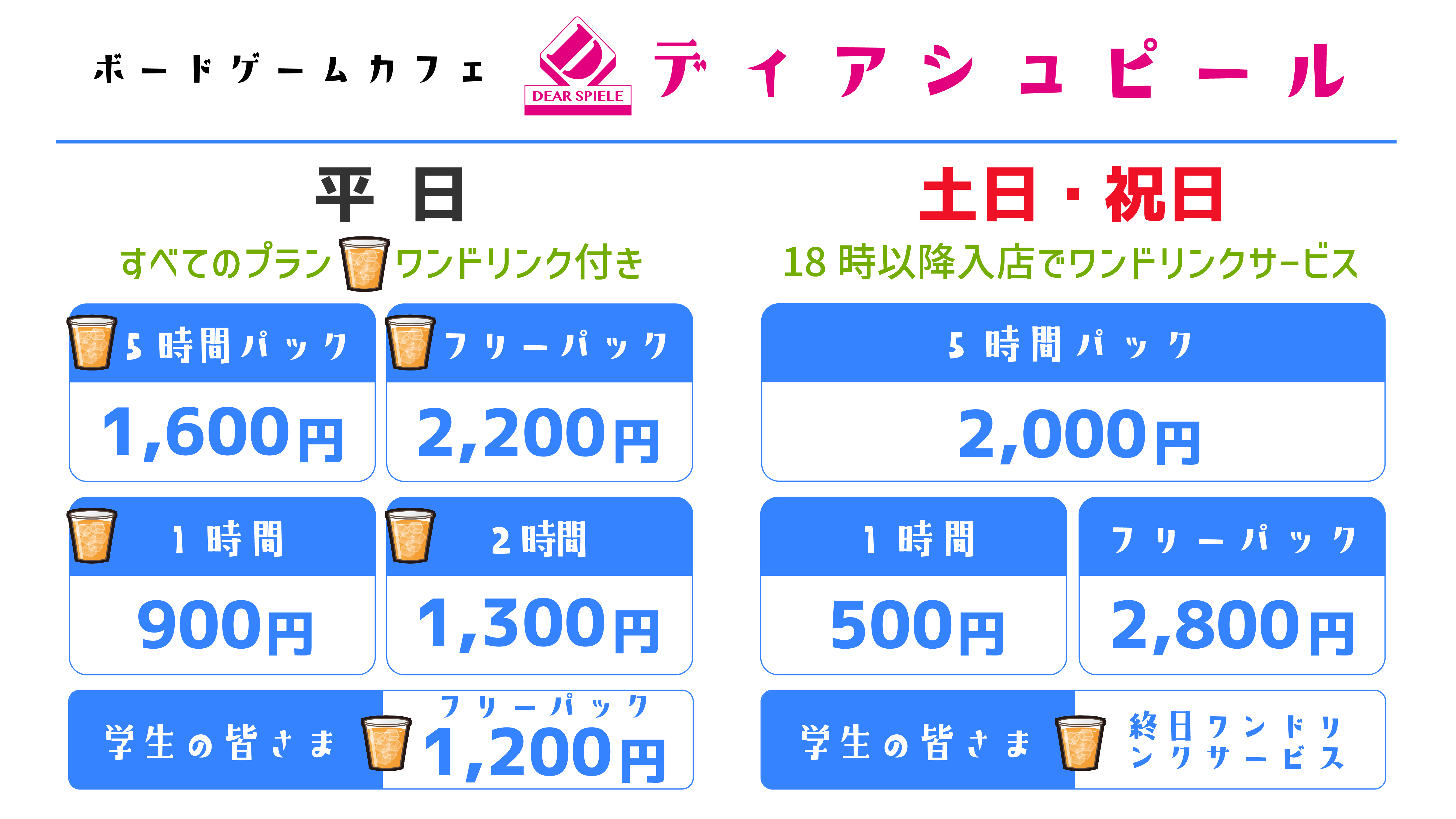 - 学生は平日、丸一日1,200円(ワンドリンク付き)&休日はワンドリンクサービス