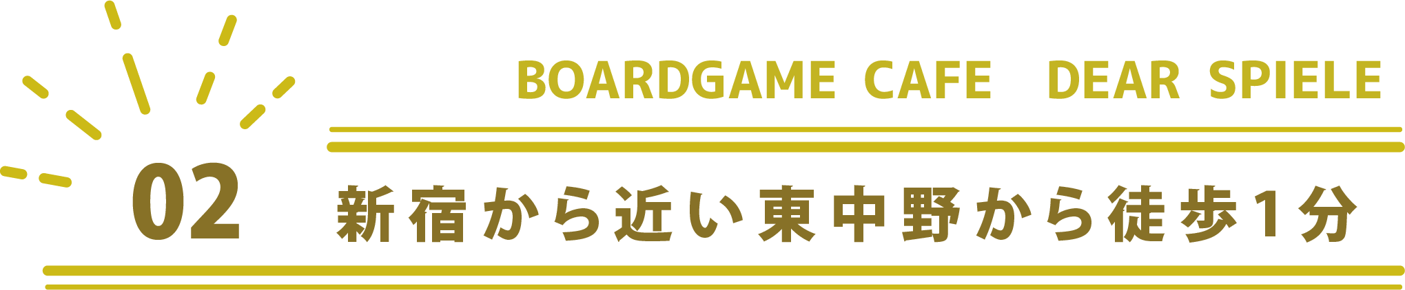 新宿からJR総武線で2駅(約5分)、中野より新宿寄りで、新宿区との境目!そして、東中野駅からも徒歩1分で辿り着くことが出来る……そんなボードゲームカフェになります。