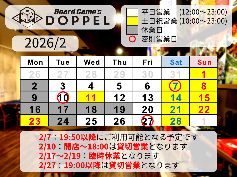 - 18日前2026年01月14日 16時07分頃2026/1/23(金)一部時間帯貸切営業のお知らせこんにちは!名古屋大須のボードゲームカフェBoardGame’sDOPPELです!2026/1/23(金)の19:00以降は貸切営業となります。該当時間にご来店を予定されておられましたお客様、大変申し訳ございません。16:00以降にご入店の方は18:50までの最大2時間50分を・通常パック:1...9ページビュー