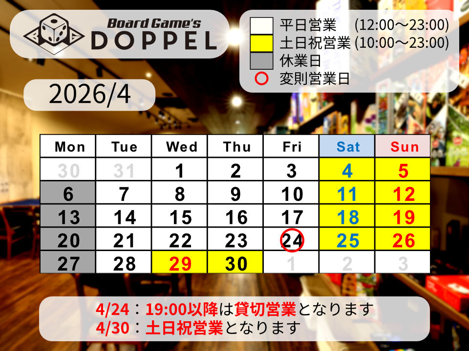 - 約2ヶ月前2026年02月08日 19時53分頃2026/2/10(火)一部時間帯貸切営業のお知らせこんにちは!名古屋大須のボードゲームカフェBoardGame’sDOPPELです!2026/2/10(火)の開店~18:00は貸切営業となります。該当時間にご来店を予定されておられましたお客様、大変申し訳ございません。18:30以降は通常営業いたします。皆様のご来店をお待ちしております。営業予...17ページビュー