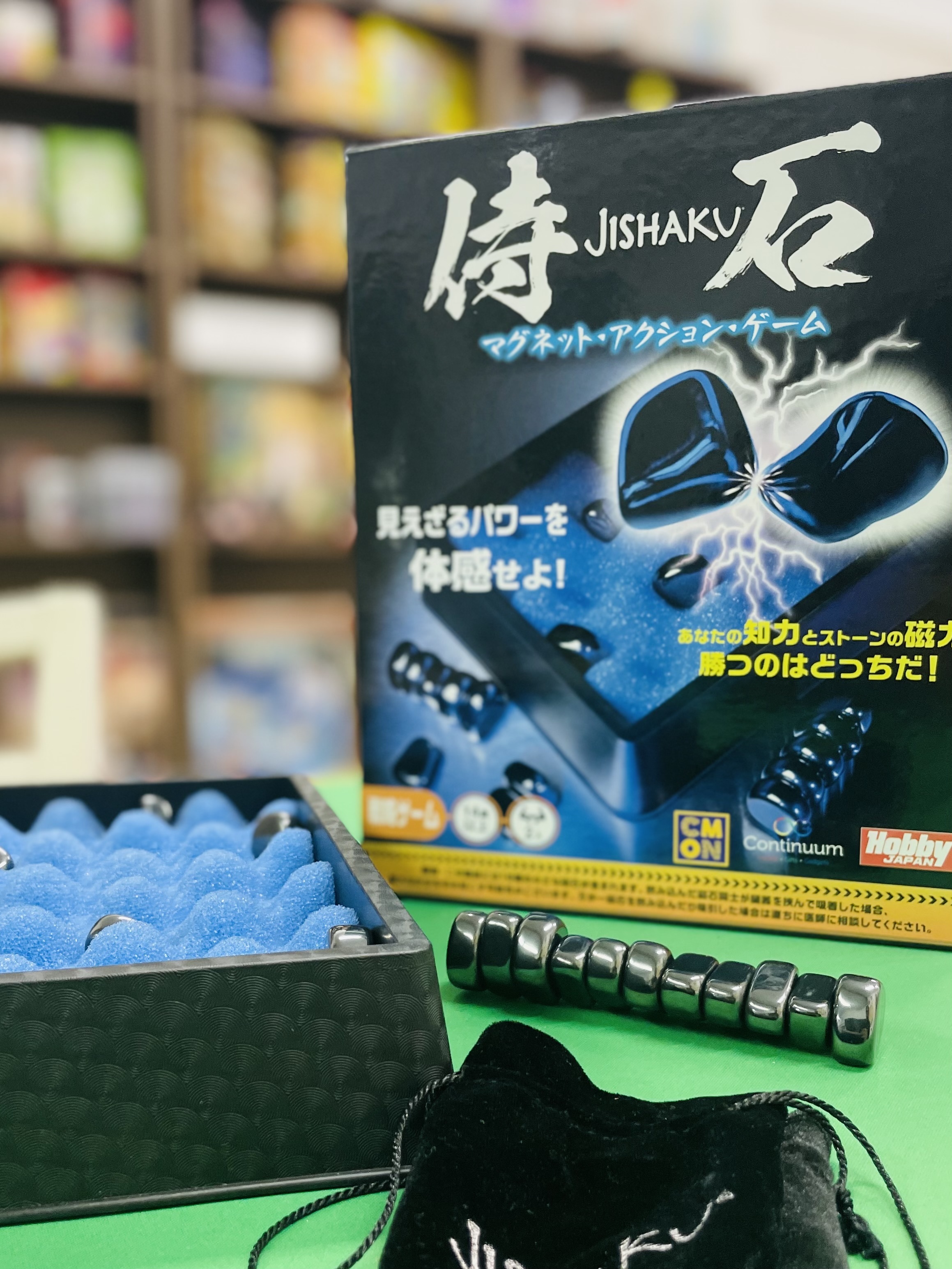 『侍石(じしゃく)』は、強力なマグネット・ストーンを使った2人用アクションゲーム。プレイヤーは交互に磁石を、フォースフィールドと呼ばれるスポンジ製ボードのくぼみに1個ずつ置いていきます。