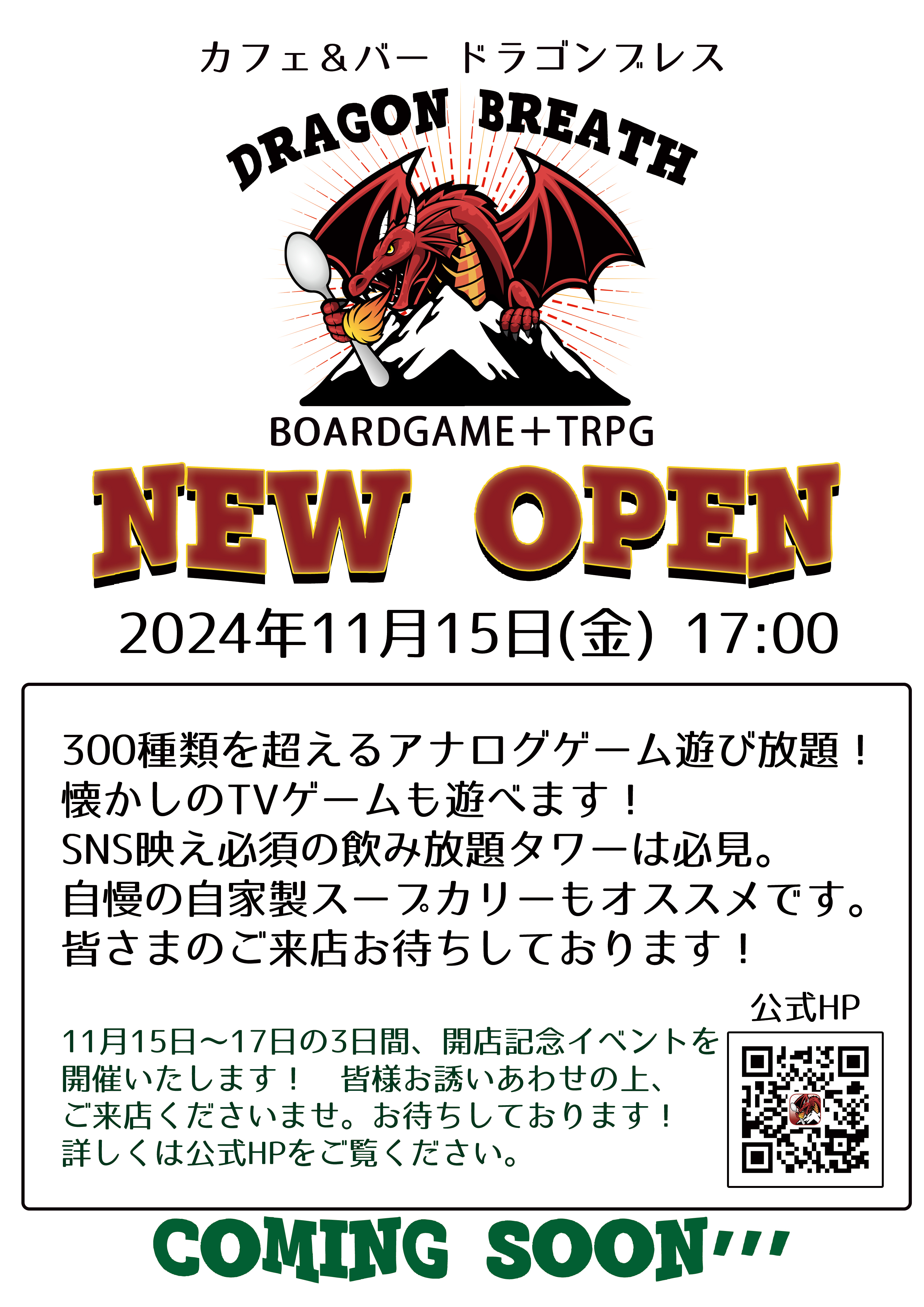 - 約1年前2024年11月03日 20時17分頃ドラブレ、移転リニューアルのお知らせです!昨年ススキノに誕生した小さな隠れ家BAR「ドラゴンブレス」。ボードゲーマー、TRPGプレイヤーの皆様に愛されてきた当店ですが、2024年11月、豊平区平岸に移転リニューアルオープンします!プレイスペースは約3倍に拡大、名物「飲み放題タワー」も超進化!勿論ゲームも遊び放題です。詳しい開店日や営業...57ページビュー
