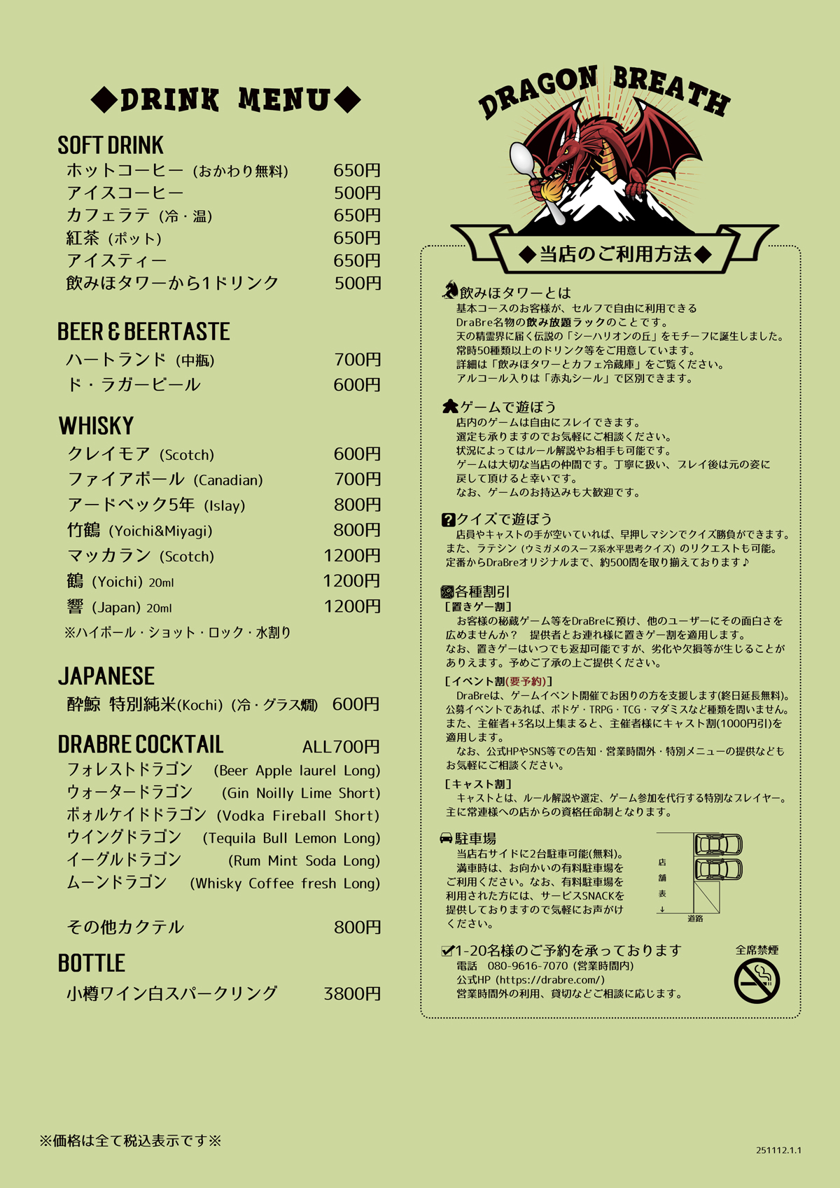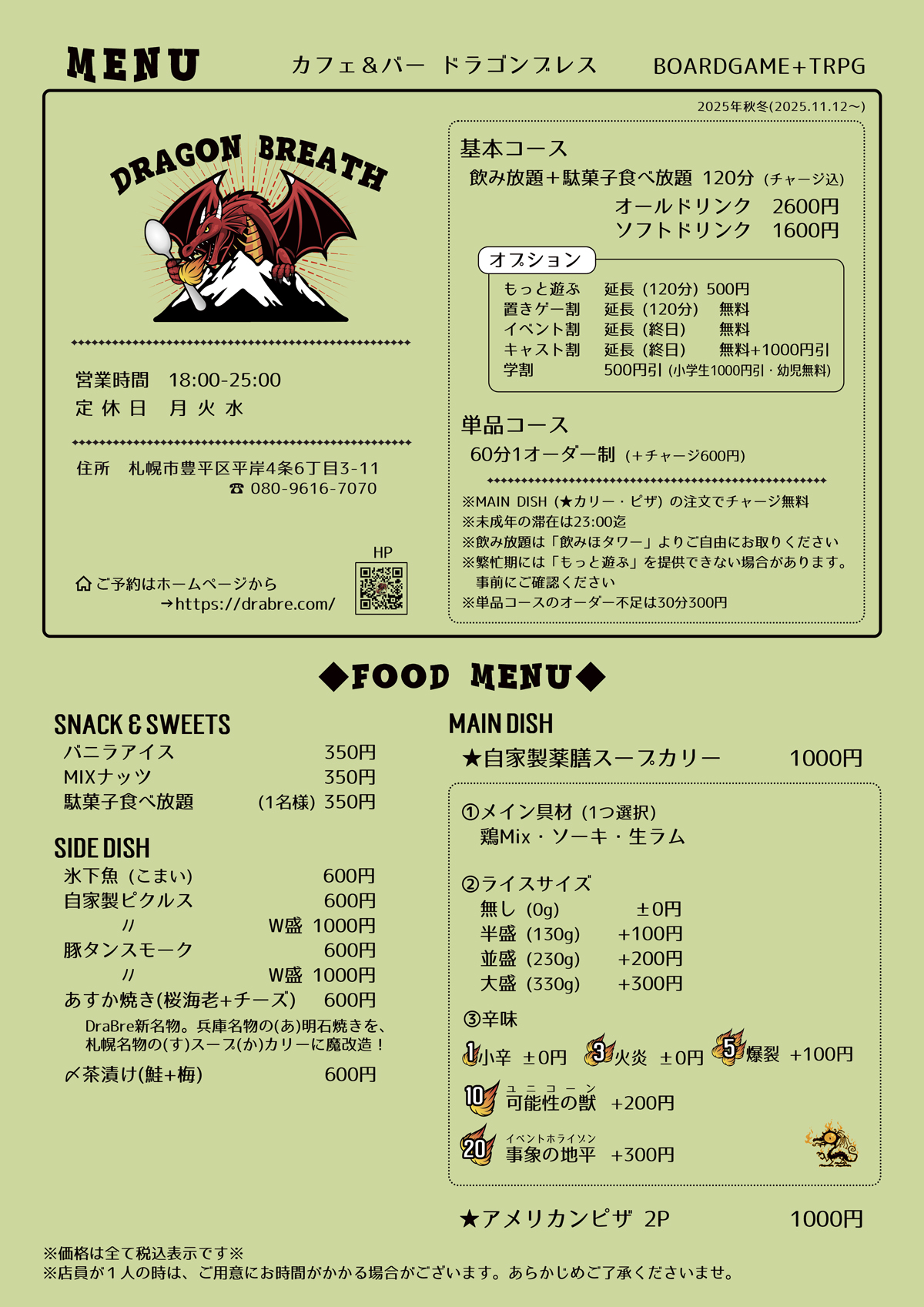01[基本コース(120分)]2600円 飲み放題!遊び放題!駄菓子食べ放題! 02[単品コース] 60分1オーダー制(+チャージ600円) 03[120分カリープラン]3600円 基本コース+スープカリー(並盛)付き 04[240分カリープラン]3900円 基本コース+スープカリー(並盛)付き 05[240分三大放題プラン]3000円 飲み放題!遊び放題!駄菓子食べ放題! 06[いつもの木曜会(終日)]2600円 飲み放題!遊び放題!駄菓子食べ放題! |