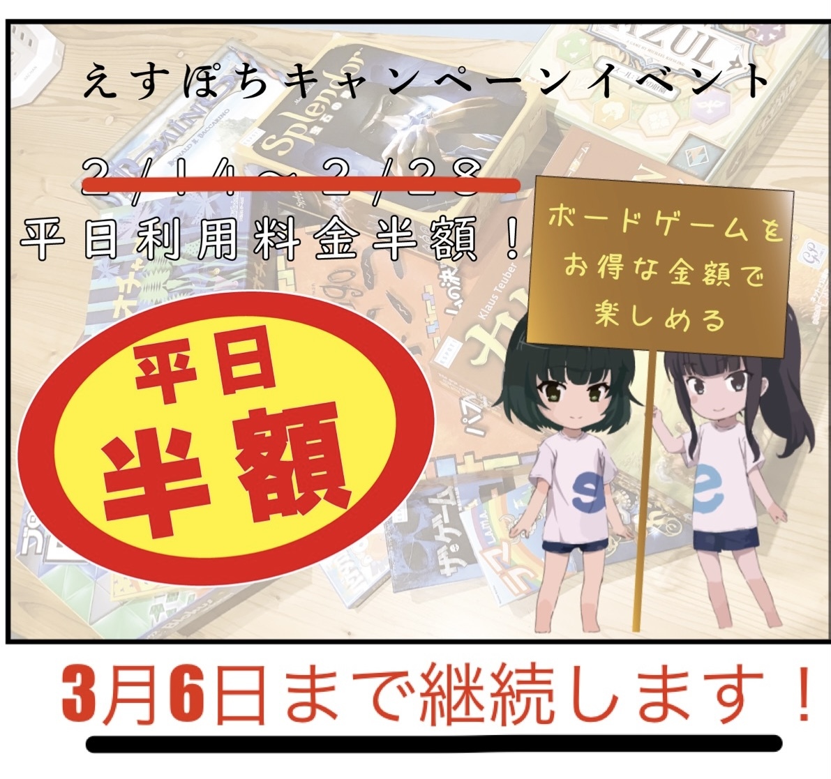- 約3年前2022年10月06日 17時48分頃お客様へお知らせです。2022年10月8日より営業を一部再開いたします。平日の営業と飲食の提供はまだ再開できませんので、ご協力をお願いいたします。再開に伴いボードゲームも増えておりますので、新作でぜひ遊んでみてください。今後ともよろしくお願い致します。298ページビュー