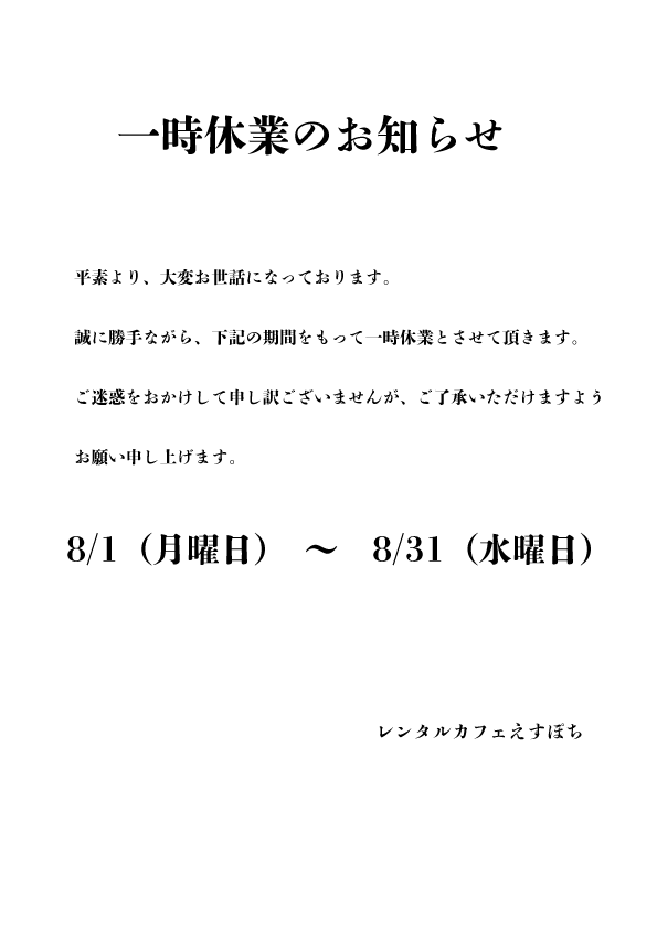- 3年以上前2022年08月08日 17時54分頃一時休業のお知らせこの度、8月いっぱいの営業を持ちまして、一時休業とさせていただきます。ご迷惑をおかけするかと思いますが、ご了承ください。9月以降の営業は未定となります・133ページビュー