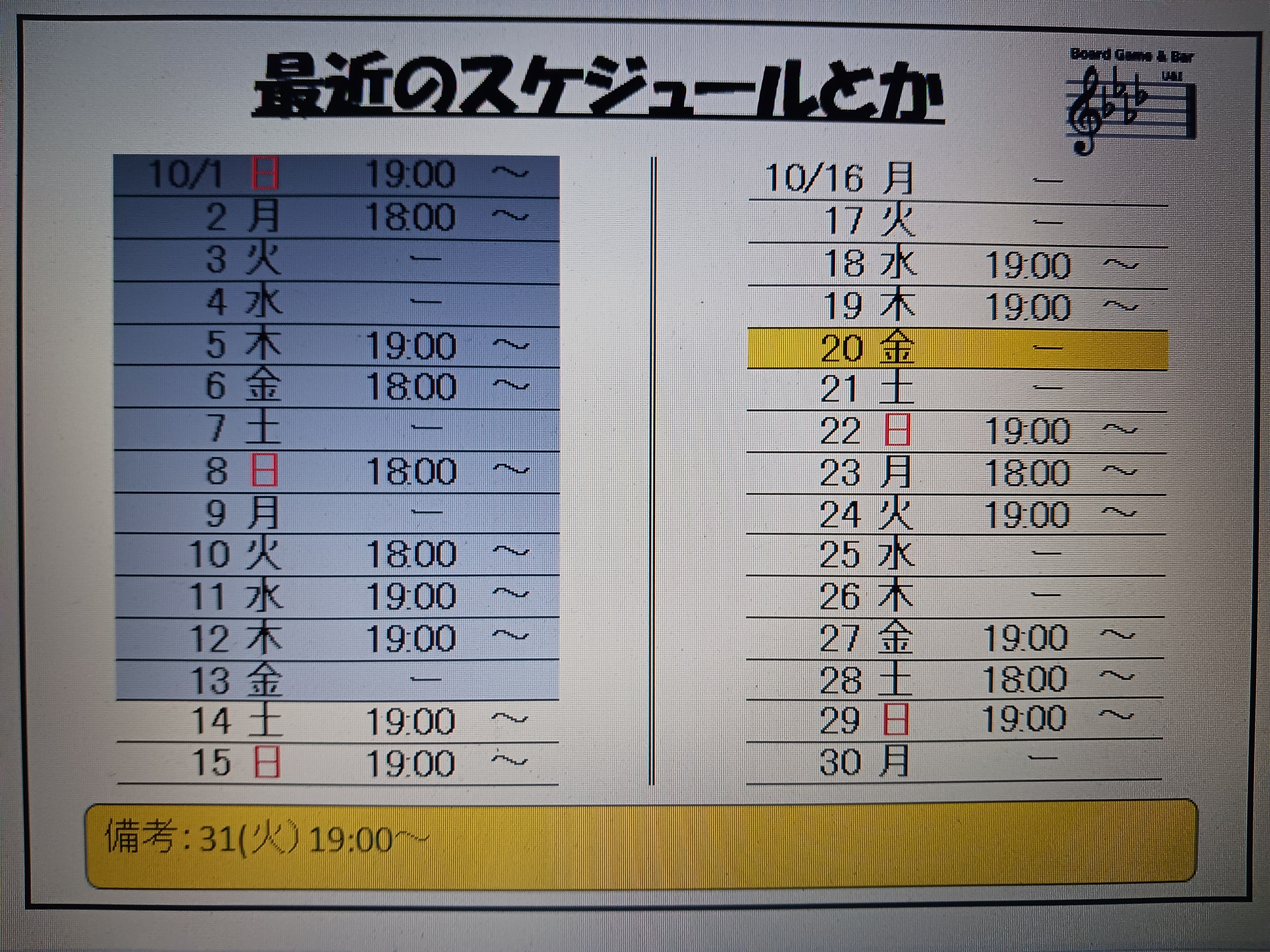 変更日、黄色に変えてあります。20日(金)と、31日(火)に変更があります。ご確認下さい。