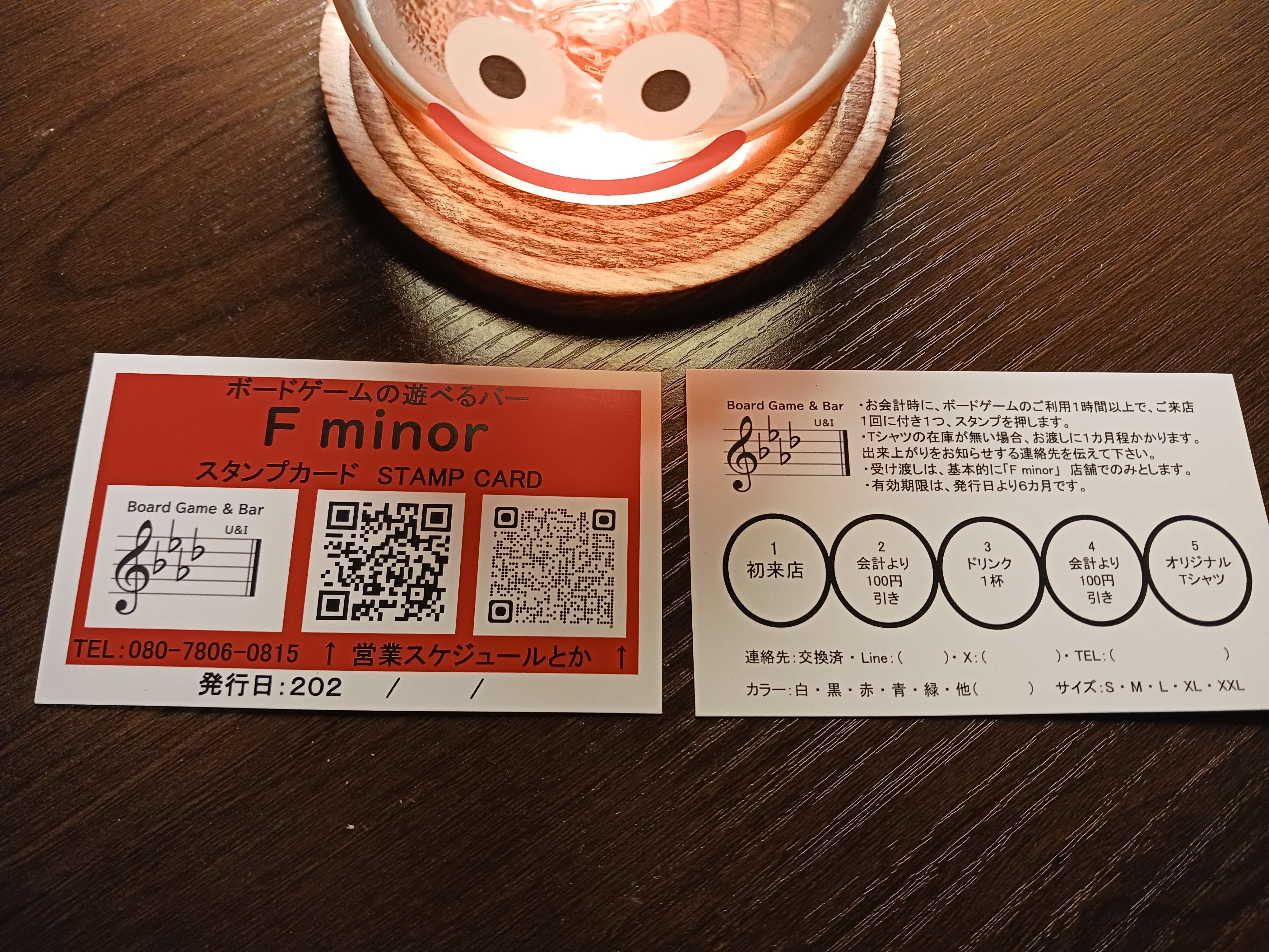 なので、私の、うちの店での、スタンプカードの目的は ①:Fminorが皆さんの名前を知りたい。(私は名刺があります) ②:リピーターを増やしたい ③:宣伝効果(皆無) ④:皆で、Tシャツ着てゲームマーケットに行く ⑤:その他(今、思いつかないけど)